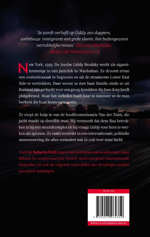 New York, 1939. In ‘De spionne van Manhattan’ van Roberta Rich heeft Giddy Brodsky geluk met haar baantje als sigarettenmeisje in een jazzclub in Manhattan, terwijl de Grote Depressie op zijn hoogtepunt is. Ze droomt ervan een cosmeticazaak te beginnen en de straatarme Lower East Side achter zich te laten, waar ze met haar familie woont sinds ze uit Rusland zijn gevlucht voor een groep Kozakken die hun dorp heeft platgebrand.