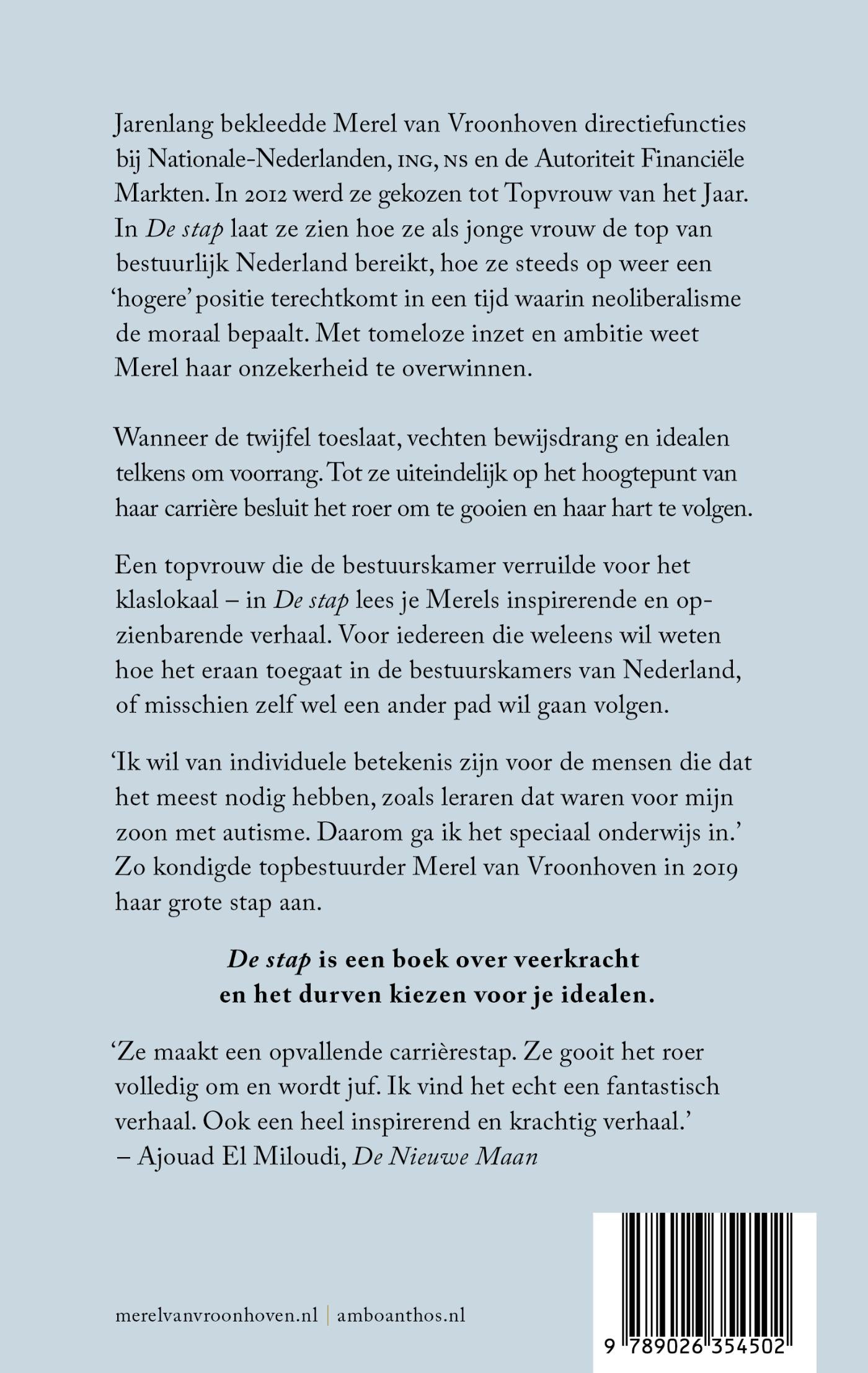 In De stap laat ze zien hoe ze als jonge vrouw de top van bestuurlijk Nederland bereikt, hoe ze steeds op weer een ‘hogere’ positie terechtkomt in een tijd waarin neoliberalisme de moraal bepaalt. Met tomeloze inzet en ambitie weet Merel haar onzekerheid te overwinnen. Wanneer de twijfel toeslaat, vechten bewijsdrang en idealen telkens om voorrang. Tot ze uiteindelijk op het hoogtepunt van haar carrière besluit het roer om te gooien en haar hart te volgen. Een topvrouw die de bestuurskamer verruilde voor het klaslokaal – in De stap lees je Merels inspirerende en opzienbarende verhaal. Voor iedereen die weleens wil weten hoe het eraan toegaat in de bestuurskamers van Nederland, of misschien zelf wel een ander pad wil gaan volgen.