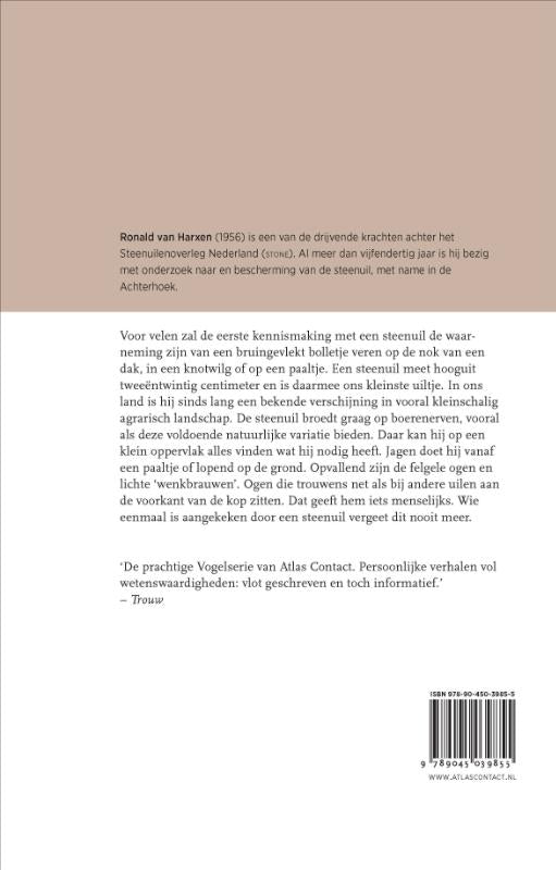 De steenuil is nauwelijks groter dan een merel en daarmee ons kleinste uiltje. In ons land is hij van oudsher een bekende verschijning in vooral kleinschalig agrarisch landschap. Het steenuiltje broedt graag op boerenerven, vooral als deze voldoende natuurlijke variatie bieden. Daar kan hij op een klein oppervlak alles vinden wat hij nodig heeft. Vanaf een verhoging zoekt de steenuil naar voedsel en vliegt daar in golvende vlucht op af. Opvallend zijn de felgele ogen en z’n lichte ‘wenkbrauwen’. Wie eenmaal is aangekeken door een steenuil vergeet dit nooit meer.