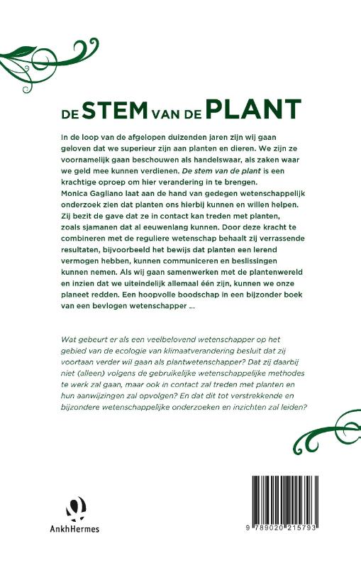 De stem van de plant van wetenschappelijk onderzoeker Monica Gagliano bewijst dat planten en bomen met elkaar communiceren en een heel eigen leven leiden. Aan de hand van vele onderzoeken en experimenten laat zij zien dat planten en bomen wel degelijk kunnen luisteren, leren, overleggen en beslissen. Ze beschikken over vaardigheden die we – volkomen onterecht – tot nu toe alleen aan onszelf en aan dieren toeschreven. En waarom zou het ook anders zijn? Het is tijd dat wij ons botanisch bewustzijn vergroten en gaan luisteren naar de plant. Dat is namelijk de hoogste tijd, zegt die plant, want onze natuurlijke omgeving verdient veel meer respect dan we haar nu geven. Een aanrader voor de lezers van Peter Wohlleben.