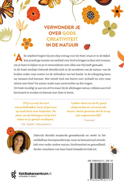 ‘De stem van de Schepper’ van Deborah Monfils is een inspirerend boek voor vrouwen over de wonderen van de alledaagse natuur: van de bodem onder onze voeten tot de uithoeken van het heelal. Wat vertelt de schepping ons over God en over onze relatie met Hem? Dit boek zet aan om bewuster om je heen te kijken en helpt je om te verstillen, vol te houden in je christelijke wandel, rust te nemen en telkens aan God herinnerd te worden. Een praktisch boek met persoonlijke verhalen en een vleugje humor.