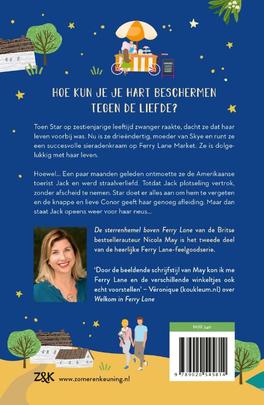 Toen Star, de hoofdpersoon in 'De sterrenhemel boven Ferry Lane' van Nicola May, op zestienjarige leeftijd zwanger raakte, dacht ze dat haar leven over was. Nu is ze drieëndertig, moeder van Skye en de eigenaar van de succesvolle sieradenkraam op Ferry Lane Market en is ze dolgelukkig met haar leven. Hoewel... Een paar maanden geleden ontmoette ze de Amerikaanse toerist Jack en Star durfde eindelijk haar hart weer open te stellen voor de liefde. Totdat Jack plotseling vertrok, zonder afscheid te nemen. Star doet er alles aan om hem te vergeten en de knappe en lieve Conor geeft haar wat afleiding. Maar dan staat Jack opeens weer voor haar neus... 'De sterrenhemel boven Ferry Lane' van Nicola May is het tweede deel van de hilarische Ferry Lane-feelgoodserie.