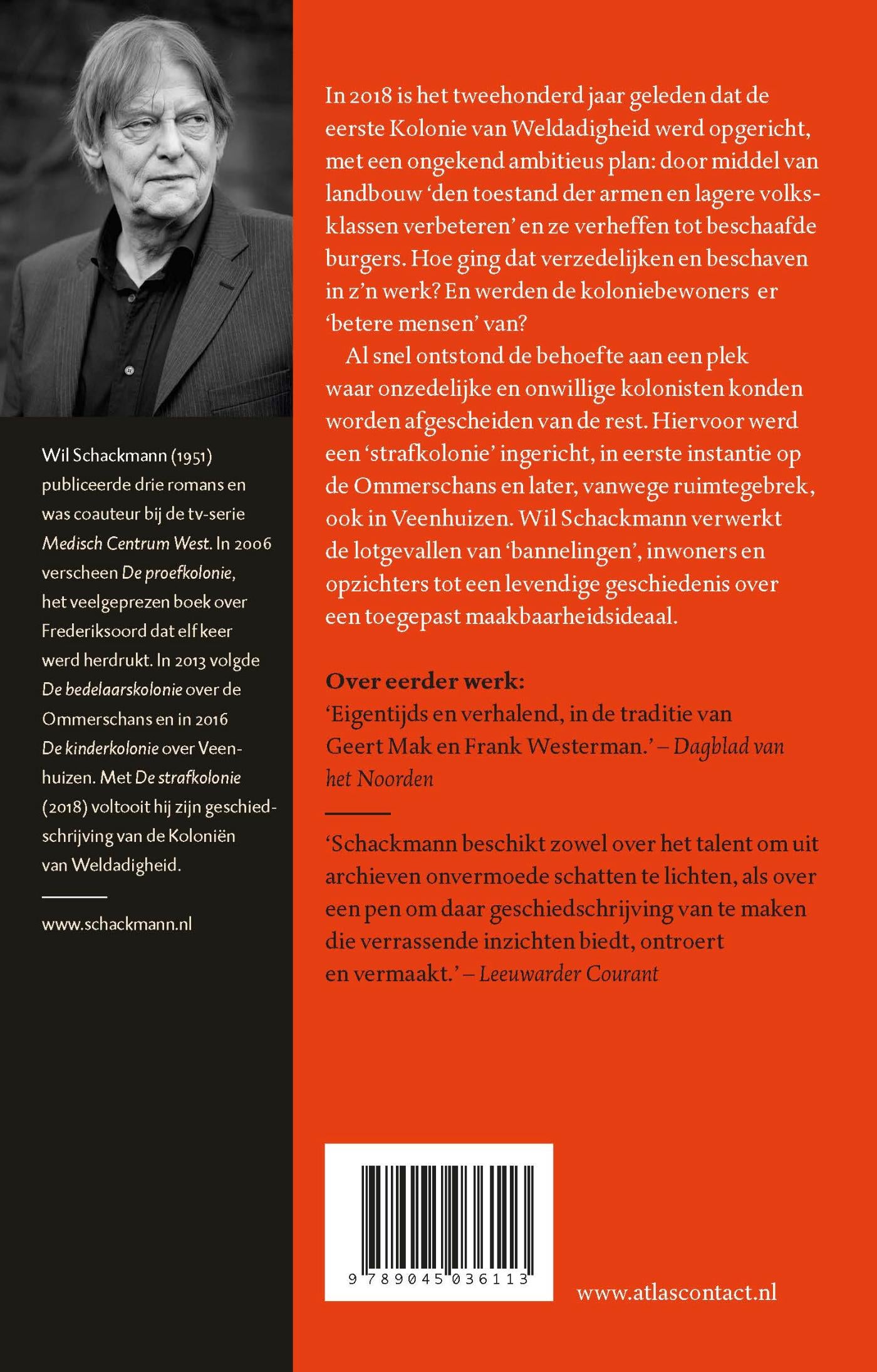 Al snel ontstond de behoefte aan een plek waar onzedelijke en onwillige kolonisten konden worden afgescheiden van de rest. Hiervoor werd een ‘strafkolonie’ ingericht, in eerste instantie op de Ommerschans en later, vanwege ruimtegebrek, ook in Veenhuizen. In De strafkolonie verwerkt Wil Schackmann de lotgevallen van ‘bannelingen’, inwoners en opzichters tot een levendige geschiedenis over een toegepast maakbaarheidsideaal.