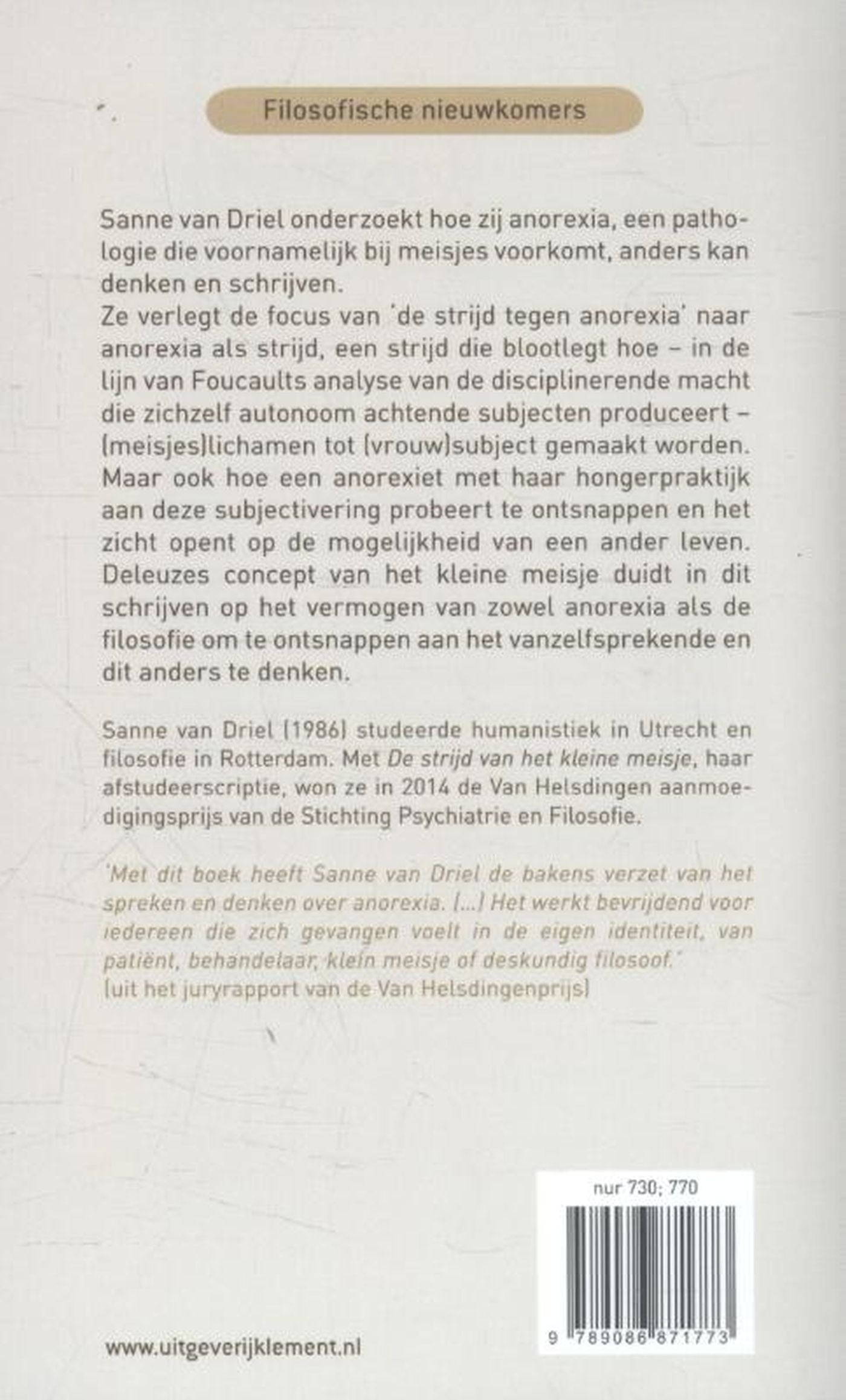 Sanne van Driel onderzoekt hoe zij anorexia, een pathologie die voornamelijk bij meisjes voorkomt, anders kan denken en schrijven. Ze verlegt de focus van 'de strijd tegen anorexia' naar anorexia als strijd, een strijd die blootlegt hoe - in de lijn van Foucaults analyse van de disciplinerende macht die zichzelf autonoom achtende subjecten produceert - (meisjes)lichamen tot (vrouw)subject gemaakt worden. Maar ook hoe een anorexiet met haar hongerpraktijk aan deze subjectivering probeert te ontsnappen en het zicht opent op de mogelijkheid van een ander leven. Deleuzes concept van het kleine meisje duidt in dit schrijven op het vermogen van zowel anorexia als de filosofie om te ontsnappen aan het vanzelfsprekende en dit anders te denken. 'Met dit boek heeft Sanne van Driel de bakens verzet van het spreken en denken over anorexia. (...) Het werkt bevrijdend voor iedereen die zich gevangen voelt in de eigen identiteit, van patiënt, behandelaar, klein meisje of deskundig filosoof.' (uit het juryrapport van de Van Helsdingenprijs) Sanne van Driel (1986) studeerde humanistiek in Utrecht en filosofie in Rotterdam. Met 'De strijd van het kleine meisje', haar afstudeerscriptie, won ze in 2014 de Van Helsdingen aanmoedigingsprijs van de Stichting Psychiatrie en Filosofie.
