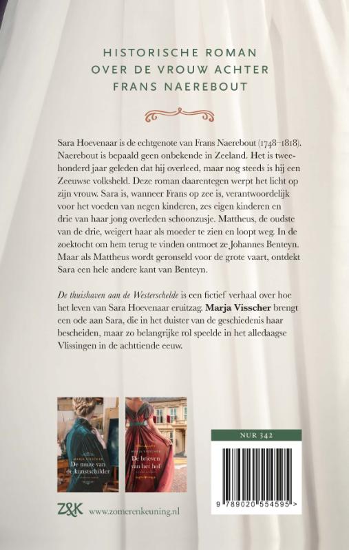 'De thuishaven aan de Westerschelde' van Marja Visscher gaat over Sara Hoevenaar, de echtgenote van Frans Naerebout. Naerebout (1748-1818) is bepaald geen onbekende in Zeeland. Het is tweehonderd jaar geleden dat hij overleed en nog altijd is bij koninklijk besluit bepaald dat minstens één vaartuig van het Nederlandse loodswezen de naam Frans Naerebout zal dragen. Verder is er een standbeeld voor hem geplaatst op de boulevard van Vlissingen, ligt hij begraven in de grote kerk van Goes en komt zijn naam voor in het Zeeuwse volkslied. Maar hoe zag zijn leven eruit? Marja Visscher belicht dat aan de hand van zijn echtgenote Sara Hoevenaar. Deze historische roman neemt je mee naar het Vlissingen van de achttiende eeuw.