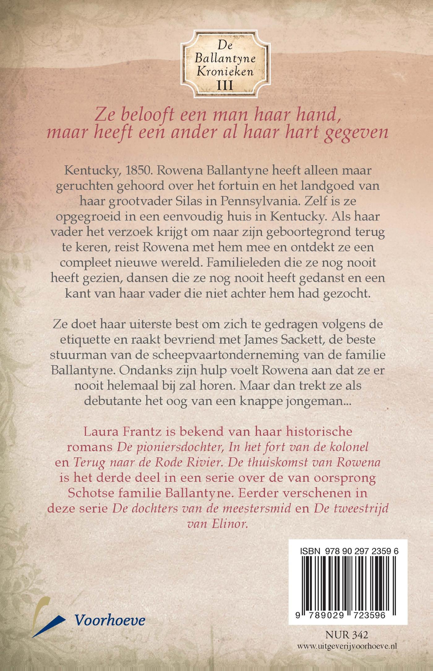 In het romantische boek `De thuiskomst van Rowena van Laura Frantz belooft een jonge vrouw een knappe man haar hand, terwijl ze een ander al haar hart heeft gegeven... Kentucky, 1950. Als de vader van Rowena Ballantyne het verzoek krijgt om terug te keren naar Pittsburgh, ontdekt Rowena een fascinerende wereld vol familieleden die ze nog nooit heeft ontmoet. Ze doet haar best om zich te gedragen volgens de strenge etiquette. Maar ondanks de hulp van James Sackett, de beste stuurman van de scheepvaartonderneming van de familie Ballantyne, denkt Rowena dat ze er nooit helemaal bij zal horen. Totdat ze als debutante het oog trekt van een knappe jongeman... `De thuiskomst van Rowena is het derde deel in Laura Frantz serie `De Ballantyne Kronieken over de van oorsprong Schotse familie Ballantyne.