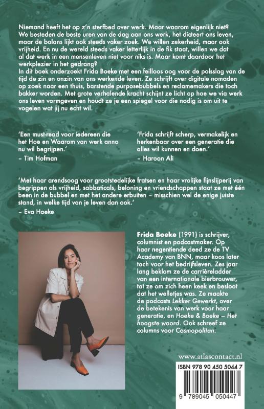 In dit boek onderzoekt Frida Boeke de zin en onzin van ons werkende leven: burnouts te lijf gaan met kikkergif, influencers met morele dilemmas, bonje in de bedrijfskantine en reclamemakers die toch bakker worden. Haar verhalen en reflecties schijnen licht op hoe we via werk ons leven vormgeven en houden je een spiegel voor die nodig is om uit te vogelen wat je nou écht wil.