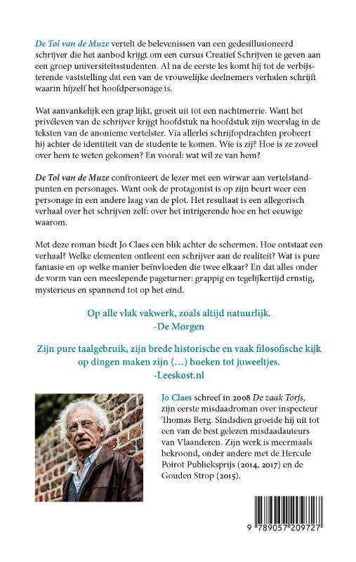 Met deze roman biedt Jo Claes een blik achter de schermen. Hoe ontstaat een verhaal? Welke elementen ontleent een schrijver aan de realiteit? Wat is pure fantasie en op welke manier beïnvloeden die twee elkaar? En dat alles onder de vorm van een meeslepende pageturner: grappig en tegelijkertijd ernstig, mysterieus en spannend tot op het eind.