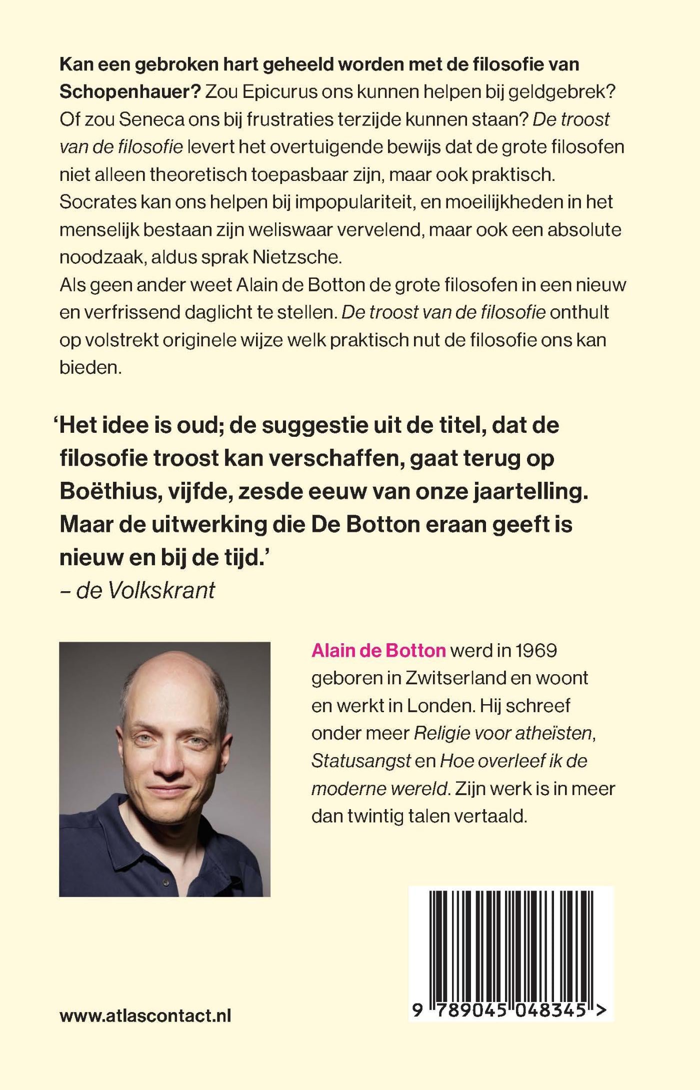 Kan Socrates ons helpen bij impopulariteit? Of zou Epicurus ons bij geldgebrek en Seneca ons bij frustraties terzijde kunnen staan? ‘De troost van de filosofie’ van Alain de Botton levert het overtuigende bewijs dat de grote filosofen beslist niet alleen theoretisch toepasbaar zijn. Een gebroken hart kan geheeld worden met de filosofie van Schopenhauer en moeilijkheden in het menselijk bestaan zijn weliswaar vervelend maar ook een absolute noodzaak, aldus sprak Nietzsche.