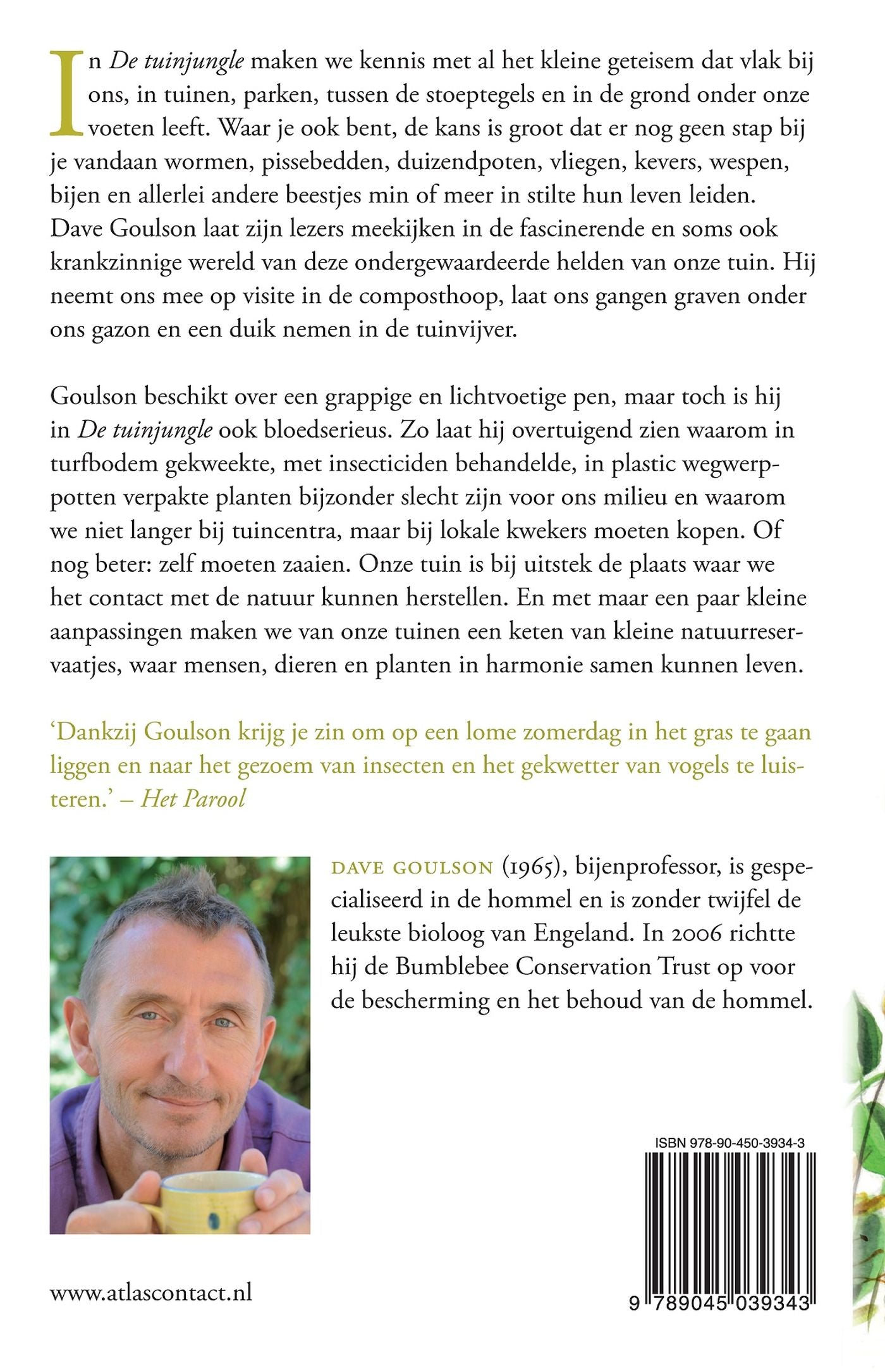 In ‘De tuinjungle’ laat Dave Goulson ons kennismaken met al het kleine geteisem dat vlak bij ons, in tuinen, parken, tussen de stoeptegels en in de grond onder onze voeten leeft. Waar je ook bent, de kans is groot dat er nog geen stap bij je vandaan wormen, pissebedden, duizendpoten, vliegen, kevers, wespen, bijen en allerlei andere beestjes min of meer in stilte hun leven leiden. Goulson laat zijn lezers meekijken in de fascinerende en soms ook krankzinnige wereld van deze ondergewaardeerde helden van onze tuin. Hij neemt ons mee op visite in de composthoop, laat ons gangen graven onder ons gazon en een duik nemen in de tuinvijver.