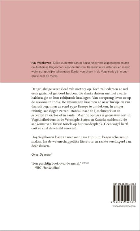 De Turkse tortel van bioloog en kunstenaar Hay Wijnhoven is een prachtige monografie over deze Turkse duivensoort. Hun grijsbeige verenkleed valt niet erg op. Toch zal iedereen ze wel eens gezien of gehoord hebben, die slanke duiven met het zwarte halskraagje en hun robijnrode kraalogen. Van oorsprong leven ze op de savanne in India. De Ottomanen brachten ze naar Turkije en van daaruit begonnen ze rond 1930 Europa te ontdekken. In amper twintig jaar vlogen ze van Istanbul naar de IJsselmeerkust en groeiden ze explosief in aantal. Maar de opmars is geenszins gestuit! Vogelliefhebbers in de Verenigde Staten en Canada melden nu de aankomst van Turkse tortels op hun voederplank. Geen vogel heeft ooit zo snel de wereld veroverd.