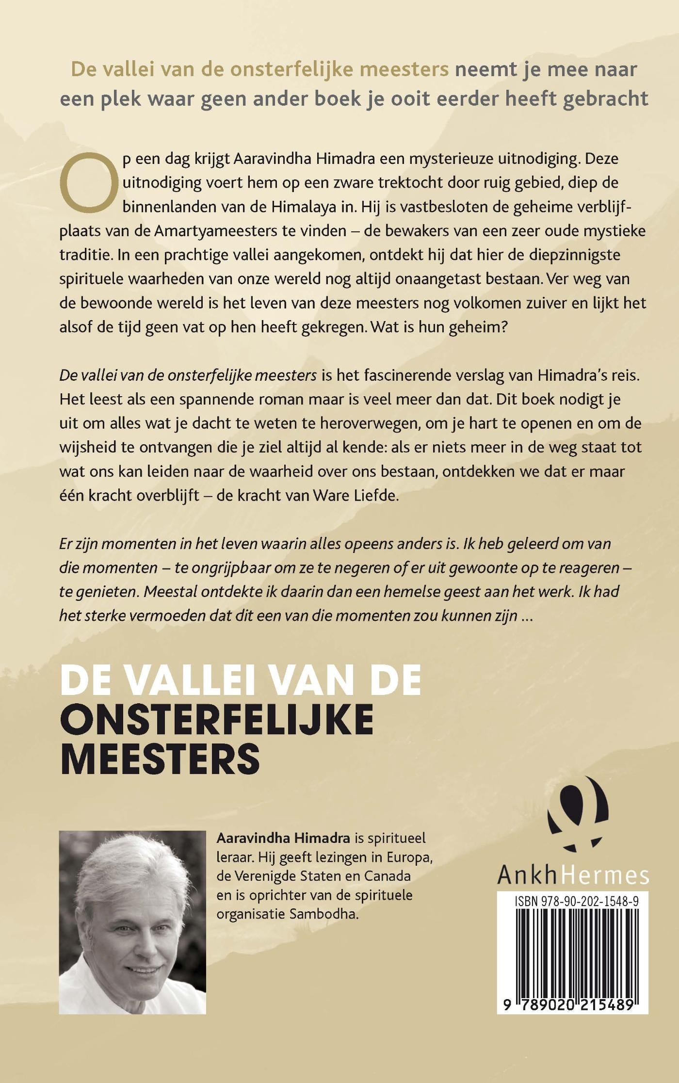 Met De vallei van de onsterfelijke meesters schreef Aaravindha Himadra een internationale bestseller. Hij vertelt over een zware reis over moeilijk begaanbare paden die hij onderneemt naar het hart van de Himalaya, op zoek naar de Meesters van Amartya. Deze meesters bewaren een schat aan spirituele wijsheid. In een prachtige vallei, ver weg van de bewoonde wereld en omgeven door adembenemend mooi natuurschoon leven zij al eeuwenlang een zuiver leven. Het lijkt alsof de tijd geen vat op hen heeft. Himadra gaat op zoek naar het geheim van hun levenskracht en neemt je mee naar een plek waar geen ander boek je ooit bracht. Een pageturner vanaf het allereerste begin!