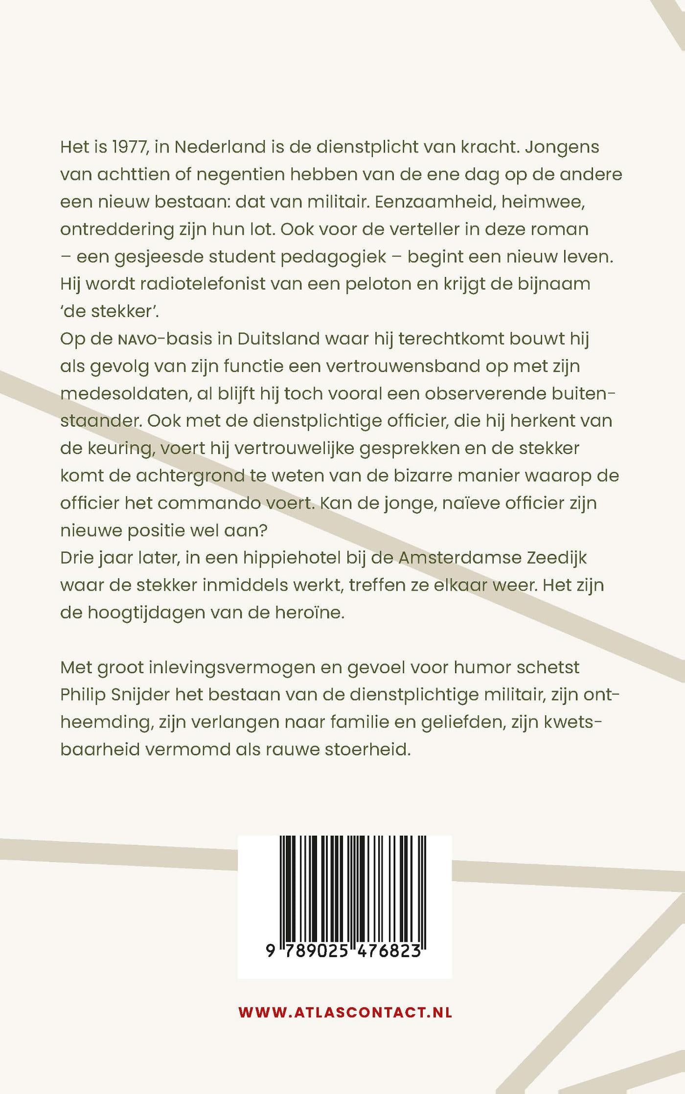 Het is 1977, in Nederland is de dienstplicht van kracht. Jongens van achttien of negentien hebben van de ene dag op de andere een nieuw bestaan: dat van militair. Eenzaamheid, heimwee, ontreddering zijn hun lot. Ook voor de verteller in deze roman een gesjeesde student pedagogiek begint een nieuw leven. Hij wordt radiotelefonist van een peloton en krijgt de bijnaam de stekker.
