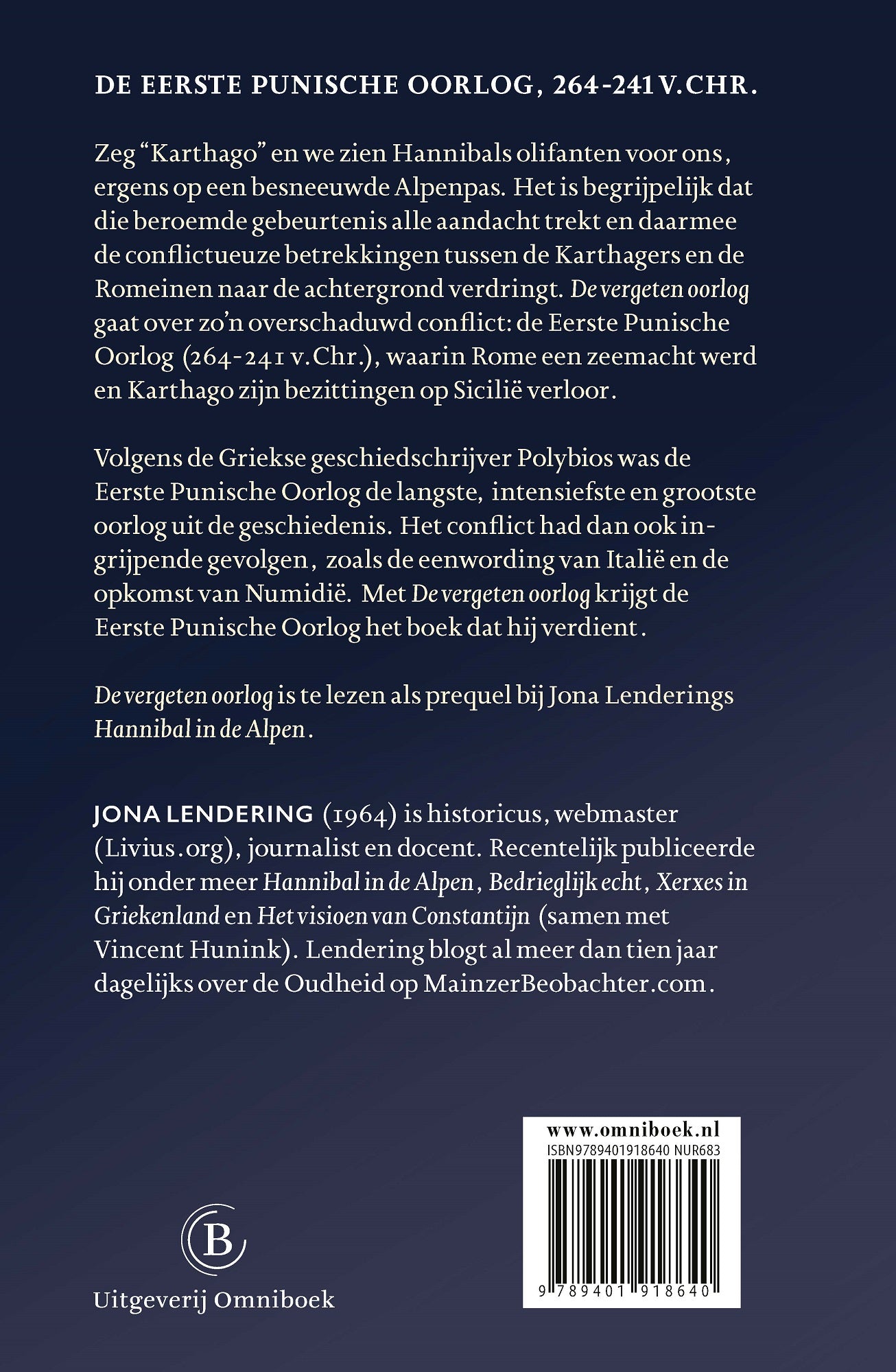 In ‘De vergeten oorlog’ behandelt Jona Lendering de Eerste Punische Oorlog (264-241 v.Chr.). Bij het woord ‘Karthago’ denken we meestal aan Hannibal met zijn olifanten, ergens op een besneeuwde Alpenpas. Het is begrijpelijk dat die gebeurtenis alle aandacht trekt, maar het was slechts één korte operatie in één oorlog, terwijl de Romeinen en Karthagers ruim een eeuw hebben gestreden om de heerschappij in het Middellandse Zeegebied. De Eerste Punische Oorlog was volgens de Griekse geschiedschrijver Polybios ‘de langste, intensiefste en grootste oorlog uit de geschiedenis’. Het conflict had dan ook ingrijpende gevolgen, zoals de eenwording van Italië, de opkomst van Numidië en maatschappelijke veranderingen. In ‘De vergeten oorlog’ laat Jona Lendering zien dat de Eerste Punische Oorlog ten onrechte overschaduwd wordt door Hannibals spectaculaire acties.