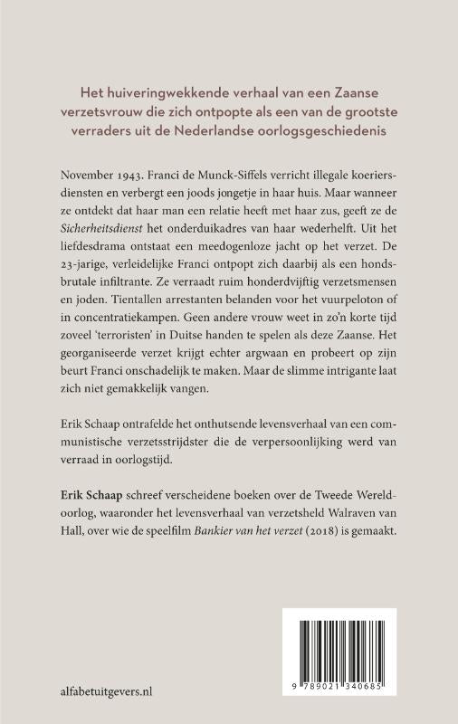 November 1943. Franci de Munck-Siffels verricht illegale koeriersdiensten en verbergt een Joods jongetje in haar huis. Maar wanneer ze ontdekt dat haar man een relatie heeft met haar zus, geeft ze de Sicherheitsdienst het onderduikadres van haar wederhelft. Uit het liefdesdrama ontstaat een meedogenloze jacht op het verzet. De 23-jarige, verleidelijke Franci ontpopt zich daarbij als een hondsbrutale infiltrante. Ze verraadt ruim honderdvijftig verzetsmensen en Joden. Tientallen arrestanten belanden voor het vuurpeloton of in de gaskamer. Geen andere vrouw weet in zo’n korte tijd zoveel ‘terroristen’ in Duitse handen te spelen als deze Zaanse vrouw. Haar vernietigende werk duurt maar kort. Een knokploeg ontmaskert de gretige jaagster. Zeven maanden na de impulsief begonnen strafexercitie tegen haar echtgenoot sterft Franci op gruwelijke wijze.