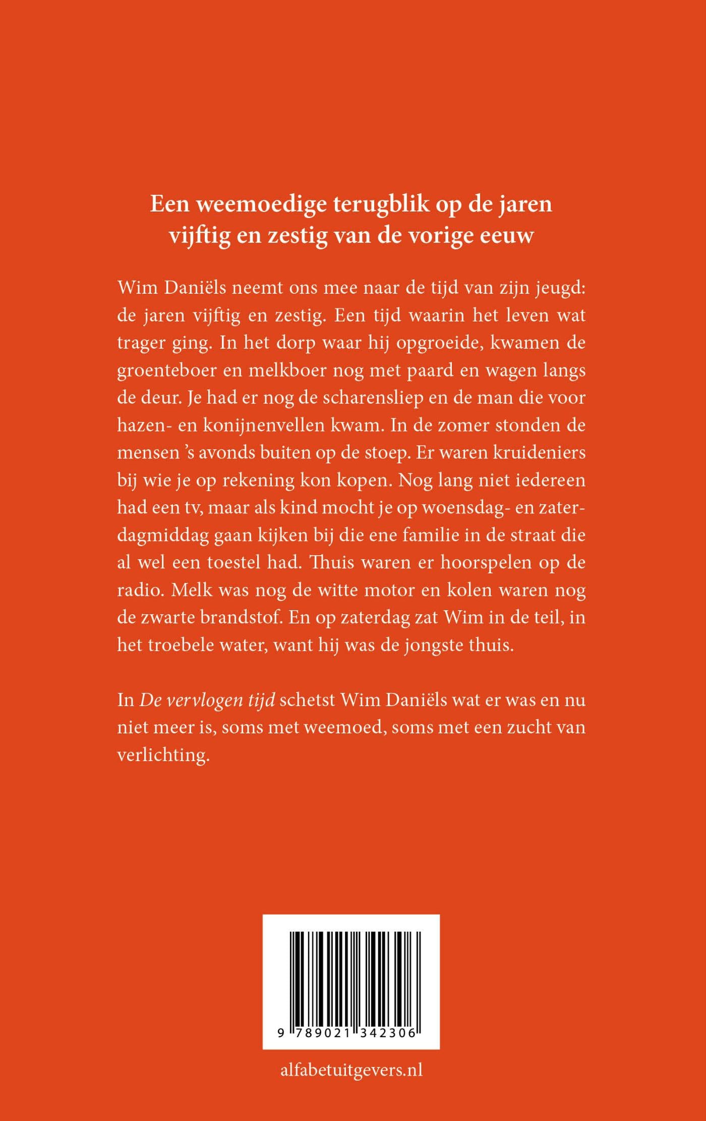 In dit boek neemt Wim Daniëls ons mee naar de tijd van zijn jeugd: de jaren vijftig en zestig. Een tijd waarin het leven wat trager ging. In het dorp waar hij opgroeide woonden nog boeren die soms met hun vee de weg blokkeerden en in alle rust het verkeer lieten wachten. In de zomer stonden de mensen ’s avonds buiten op de stoep. Er waren kruideniers waar je op rekening kon kopen. Nog lang niet iedereen had een tv, maar als kind mocht je op woensdag- en zaterdagmiddag gaan kijken bij die ene familie in de straat die al wel een toestel had. Thuis waren er de hoorspelen op de radio. Melk was nog de witte motor en kolen waren nog de zwarte brandstof. En op zaterdag zat Wim in de teil, in het troebele water, want hij was de jongste thuis. In 'De vervlogen tijd' schetst Wim wat er was en nu niet meer is, soms met weemoed, soms met een zucht van verlichting.