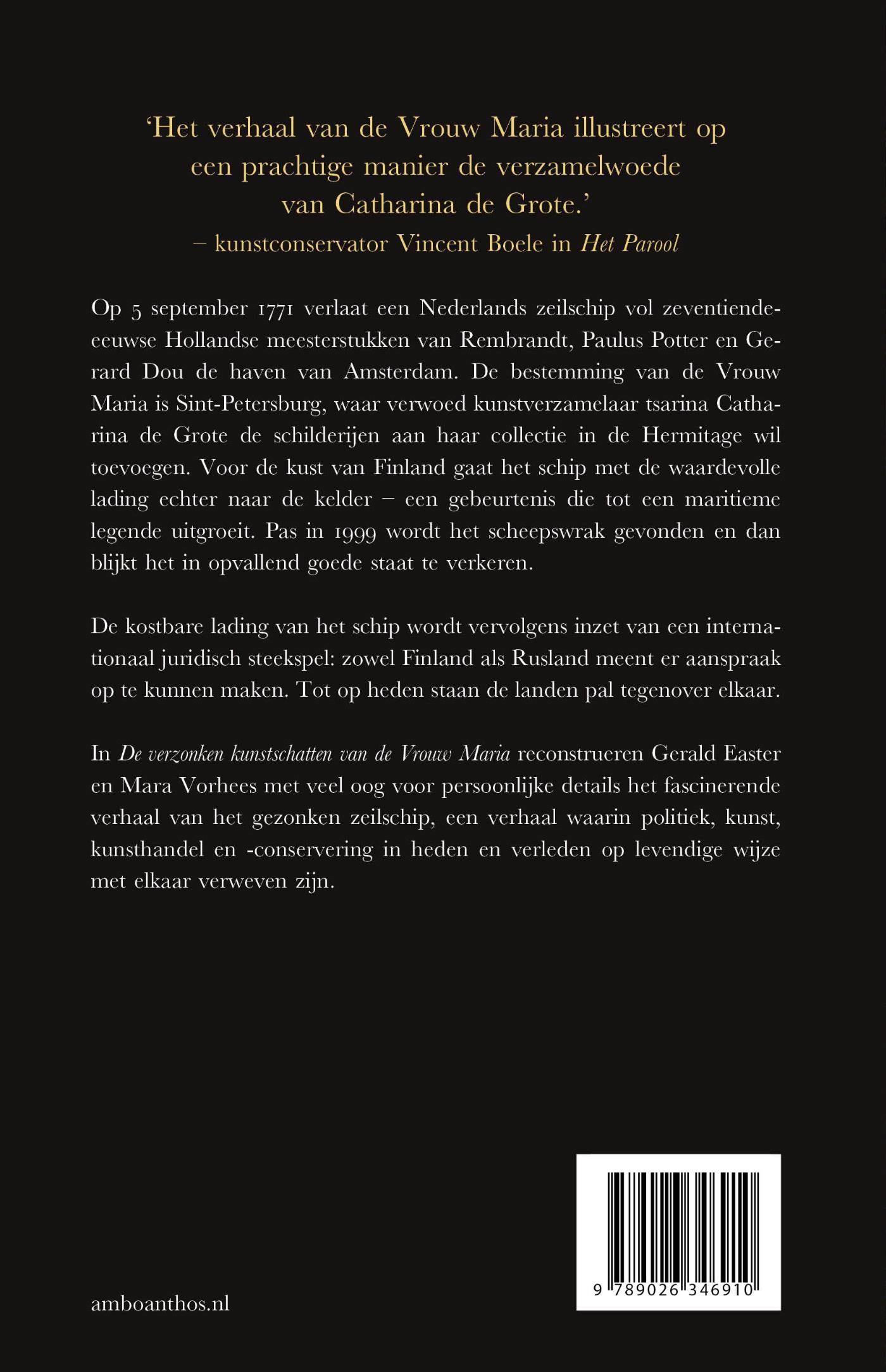 In De verzonken kunstschatten van de Vrouw Maria reconstrueren Gerald Easter en Maria Vorhees met veel oog voor persoonlijke details het fascinerende verhaal van het gezonken zeilschip, een verhaal waarin politiek, kunst, kunsthandel en -conservering in heden en verleden op levendige wijze met elkaar verweven zijn.