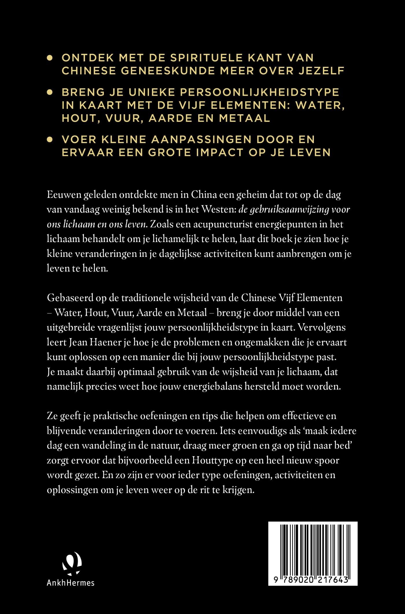 Met De vijf elementen van Jean Haner ontdek je met behulp van de spirituele Chinese geneeskunde jouw eigen unieke persoonlijkheidstype. Welk element domineert je persoonlijkheid: ben je meer een Water-, Hout-, Vuur-, Metaal-, of Aardetype? Aan de hand van een uitgebreide test kom je hier achter.