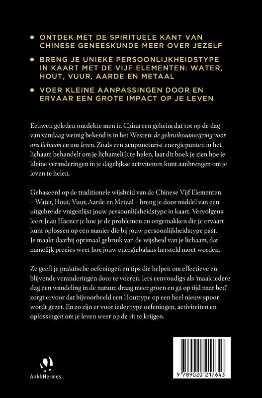 Met De vijf elementen van Jean Haner ontdek je met behulp van de spirituele Chinese geneeskunde jouw eigen unieke persoonlijkheidstype. Welk element domineert je persoonlijkheid: ben je meer een Water-, Hout-, Vuur-, Metaal-, of Aardetype? Aan de hand van een uitgebreide test kom je hier achter.