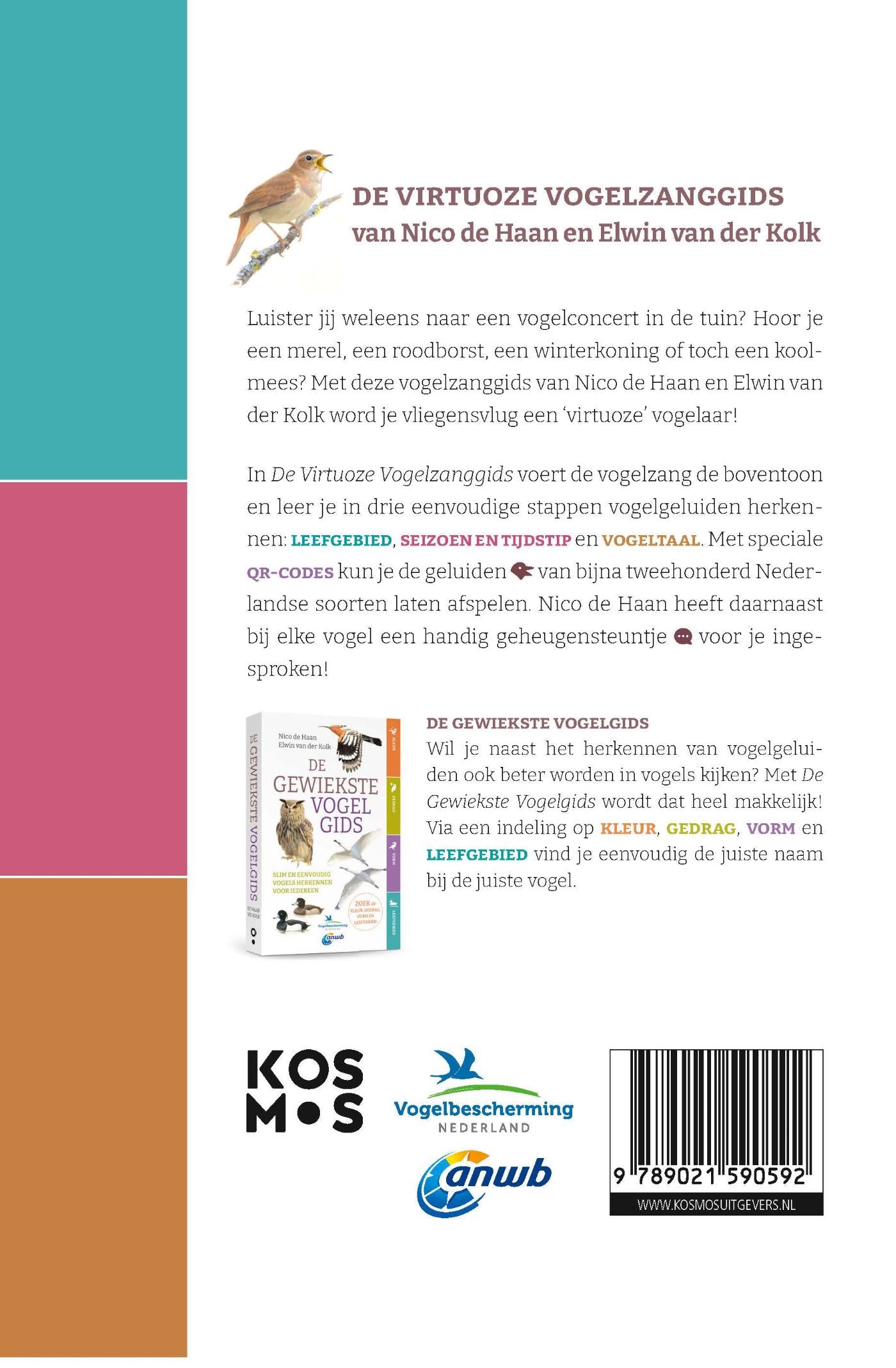 Nico de Haan leert je in drie stappen vogelgeluiden herkennen. ‘De virtuoze vogelzanggids’ bevat handige ezelsbruggetjes, vogelgeluiden en geheugensteuntjes voor het (leren) herkennen van de geluiden van bijna tweehonderd Nederlandse vogelsoorten. Voortbordurend op ‘De gewiekste vogelgids’ heeft De Haan de perfecte methode gecreëerd voor het begrijpen van vogelzang en -roep. Deze gids is geheel interactief en staat boordevol QR-codes waarmee je het vogelgeluid kunt laten afspelen. Niet alleen is het eenvoudig om zo alle geluiden te beluisteren, Nico heeft bij elke vogel ook een speciaal geheugensteuntje voor je ingesproken! Een onmisbare vogelgids voor iedereen die op een gemakkelijke manier de vogeltaal wilt leren begrijpen. Met prachtige illustraties van vogel- en natuurschilder Elwin van der Kolk.