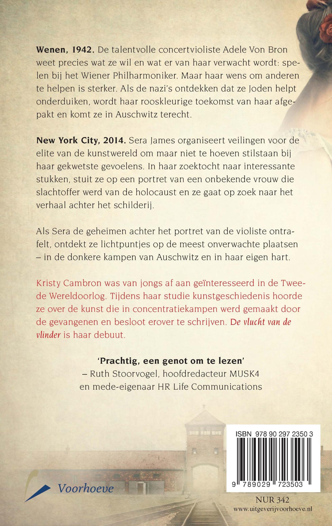 Puur kwaad en intense schoonheid floreren naast elkaar in Auschwitz in Kristy Cambrons roman `De vlucht van de vlinder New York, 2014. Sera James organiseert veilingen voor de elite van de kunstwereld. In haar zoektocht naar interessante stukken, stuit ze op een portret van een onbekend slachtoffer van de holocaust. Wenen, 1942. De talentvolle concertvioliste Adele Von Bron weet precies wat ze wil en wat er van haar verwacht wordt: spelen bij het Wiener Philharmoniker. Maar haar wens om anderen te helpen is sterker. Als de nazi s ontdekken dat ze Joden helpt onderduiken, wordt haar rooskleurige toekomst van haar afgepakt en belandt ze in de horrorwereld van Auschwitz. De vlucht van de vlinder is het eerste deel in een romanserie over kunstwerken die `verdwenen tijdens de Tweede Wereldoorlog.