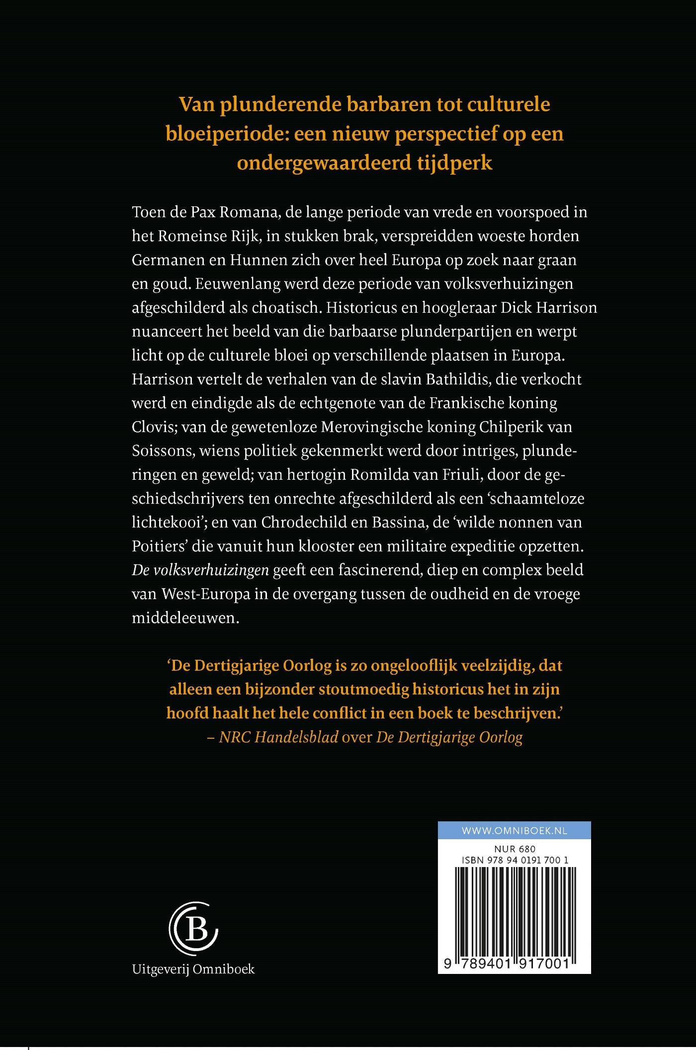 De volksverhuizingen van Dick Harrison geeft ons een rijk beeld van West-Europa in de vroege middeleeuwen. Toen de Pax Romana in stukken brak verspreidden woeste hordes Germanen en Hunnen zich over heel Europa op zoek naar graan en goud. Bestsellerauteur Dick Harrison nuanceert het beeld van die barbaarse plunderpartijen en werpt licht op de waarheid achter de mythe van chaos en verwoestingen. In het boek ontmoeten we individuele mensen: krijgers en heiligen, boeren en heersers. De volksverhuizingen geeft ons een fascinerend en complex beeld van West-Europa in de overgang tussen de oudheid en de vroege middeleeuwen.