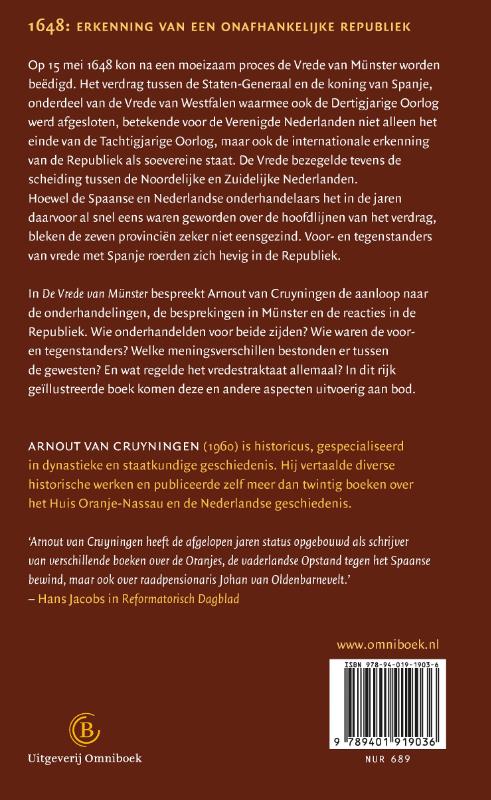 Het vredesverdrag tussen Spanje en de Nederlanden werd 375 jaar geleden op 30 januari 1648 in Münster bevestigd. Op 15 mei werd de vrede getekend en door Nederlandse en Spaanse gezanten met een eed bekrachtigd. In dit overzichtswerk wordt niet alleen aandacht besteed aan de onderhandelingen en het einde van de Tachtigjarige Oorlog, maar ook aan de weerstand van de Oranjes, de geschillen tussen de provincies, de deling tussen de noordelijke en zuidelijke Nederlanden en de andere vredesverdragen in Westfalen.