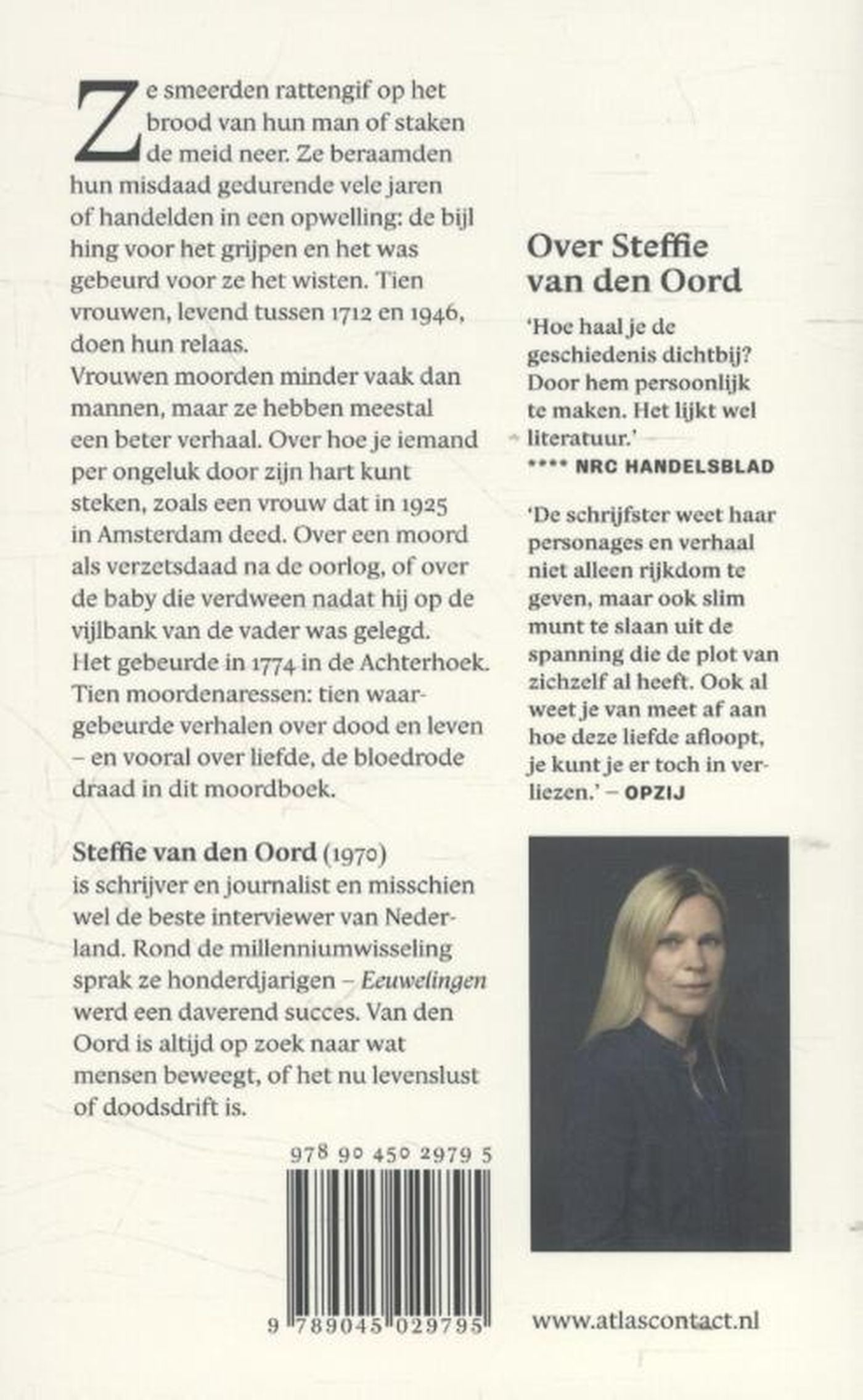 Vrouwen moorden minder vaak dan mannen, maar ze hebben meestal een beter verhaal. Over hoe je iemand per ongeluk door zijn hart kunt steken, zoals een vrouw dat in 1925 in Amsterdam deed. Over een moord als verzetsdaad na de oorlog, of over de baby die verdween nadat hij op de vijlbank van de vader was gelegd. Het gebeurde in 1774 in de Achterhoek. Tien moordenaressen: tien waargebeurde verhalen over dood en leven – en vooral over liefde, de bloedrode draad in dit moordboek.