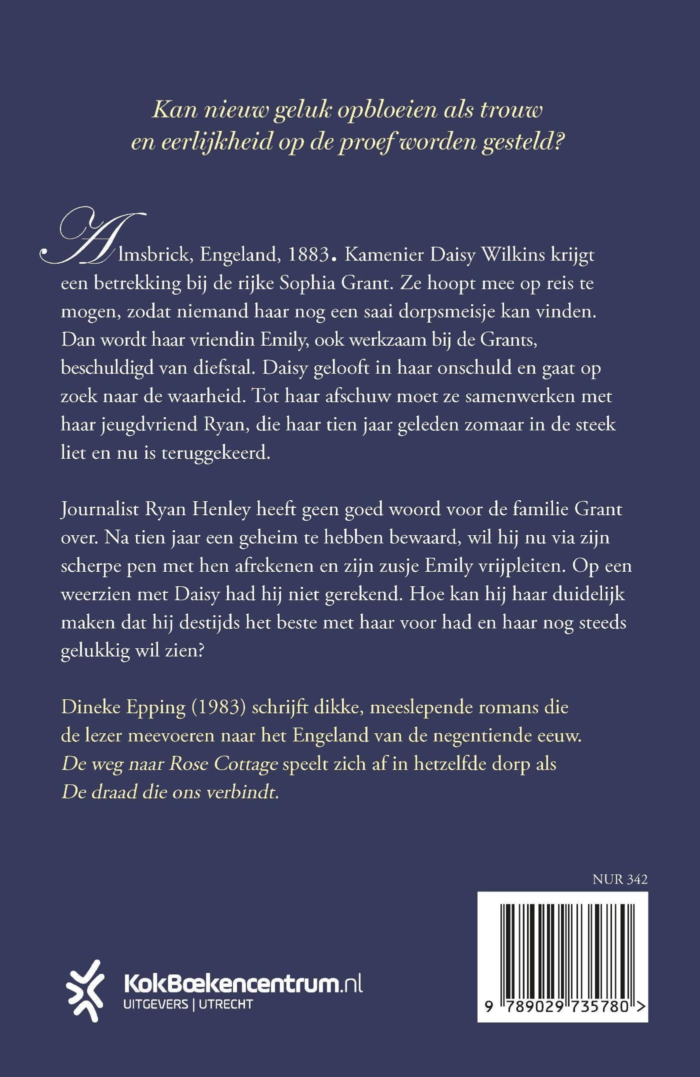 De weg naar Rose Cottage van Dineke Epping is een historische roman die zich afspeelt in negentiende-eeuws Engeland. Daisy Wilkins, kamenierster van twee jongedames, schaamt zich als ze onverwacht ontslag krijgt.