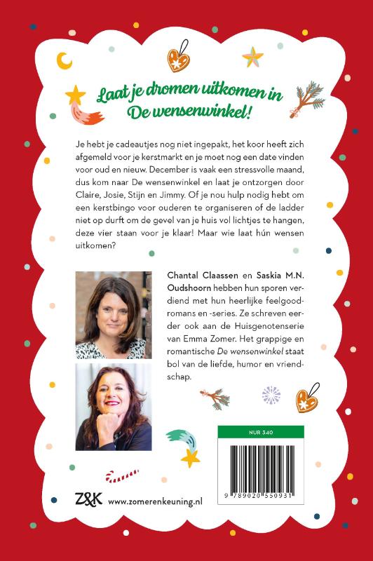 In 'De wensenwinkel' van Chantal Claassen en Saskia M.N. Oudshoorn beginnen beste vriendinnen Claire en Josie een wensenwinkel. De knappe aannemer Stijn verbouwt een oude naaisalon tot een winkel, en daarna stromen de wensen al snel binnen. De winkel is zo’n groot succes dat ze meer handen nodig hebben. Het liefst die van een man… Kan de knappe soapster Jim de vriendinnen helpen?