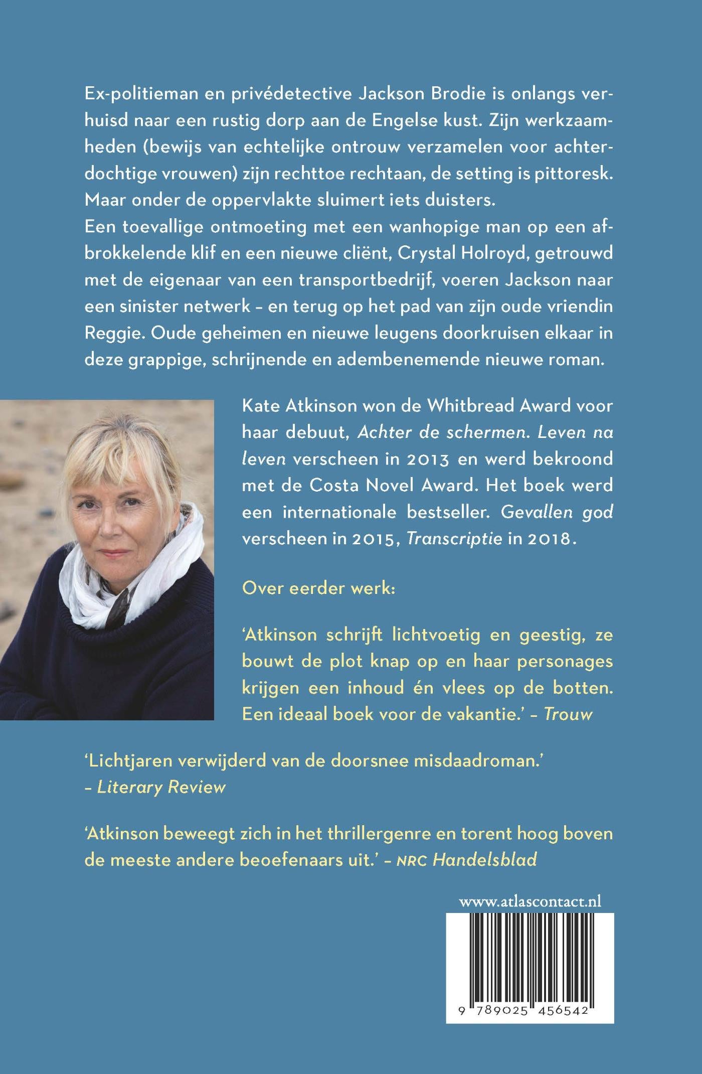 Lang voordat Kate Atkinson de bekroonde internationale bestseller Leven na leven schreef, was er de schitterende romanreeks met de onweerstaanbaar norse privédetective Jackson Brodie in de hoofdrol. In dit langverwachte nieuwe deel van de serie is Brodie terug, en onlangs verhuisd naar een rustig dorp aan de Engelse kust. Zijn werkzaamheden (bewijs van echtelijke ontrouw verzamelen voor achterdochtige vrouwen) zijn rechttoe rechtaan, de setting is pittoresk. Maar onder het oppervlak sluimert iets duisters. Een toevallige ontmoeting met een wanhopige man op een afbrokkelende klif leidt Jackson naar Crystal Holroyd, het vrachtwagenimperium van haar man Tommy, en naar een sinister netwerk – en terug op het pad van zijn oude vriend Reggie. Oude geheimen en nieuwe leugens doorkruisen elkaar in deze grappige, schrijnende en adem-benemende nieuwe roman.