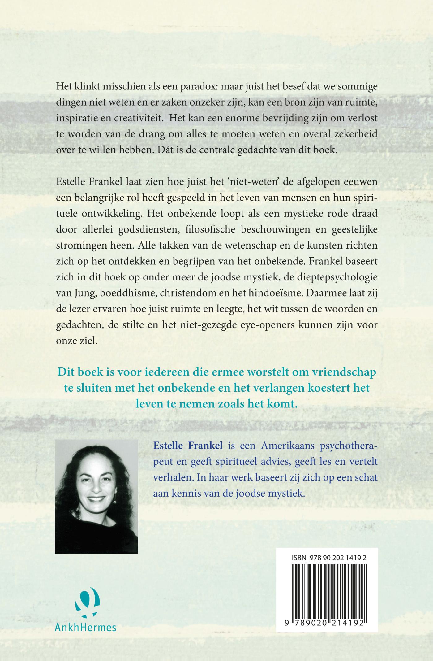Hoe we ons verhouden tot het onbekende is een belangrijk onderdeel van alle persoonlijke groei en heling. Het mysterie van het niet-weten is een belangrijk onderdeel van alle religieuze en mystieke tradities. Estelle Frankel schijnt licht op het niet-weten vanuit haar kennis van de Kabbala, dieptepsychologie, het boeddhisme, christendom en hindoeïsme. Ze laat zien hoe we kunnen groeien door ons over te geven aan de wijsheid van het niet-weten. We komen dan in een soort openheid terecht, de oprechte openheid die kinderen bijvoorbeeld nog hebben. Zij kunnen zich nog echt laten verrassen.