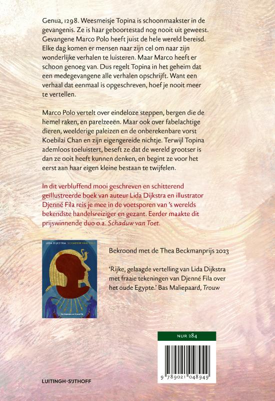 Genua, 1298, Topina is schoonmaakster in de gevangenis en is haar geboortestad nog nooit uit geweest. Gevangene Marco Polo heeft juist de hele wereld bereisd. Elke dag komen er mensen naar de gevangenis om zijn wonderlijke verhalen te horen. Maar Marco heeft er schoon genoeg van. Dus regelt Topina in het geheim dat een medegevangene alle verhalen opschrijft. Want een verhaal dat eenmaal is opgeschreven, hoef je nooit meer te vertellen.