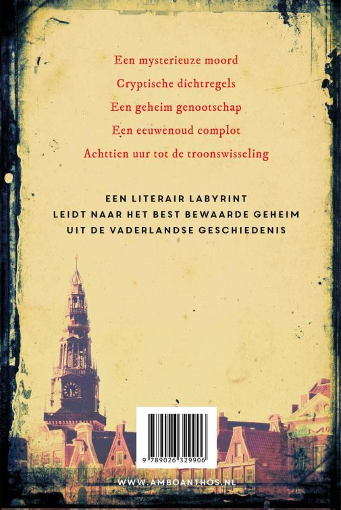 Amsterdam, 29 april 2013. Achttien uur tot de troonswisseling. In de Oude Kerk wordt een lijk gevonden op een grafschrift van Vondel. Zelfmoord, zegt de politie, maar journaliste Maaike van Reede vertrouwt het niet. Ze gaat op onderzoek uit en voor ze het weet is ze beland in een doolhof van dichtregels en cryptische verwijzingen. Professor Olivier Huizinga helpt haar in haar zoektocht.