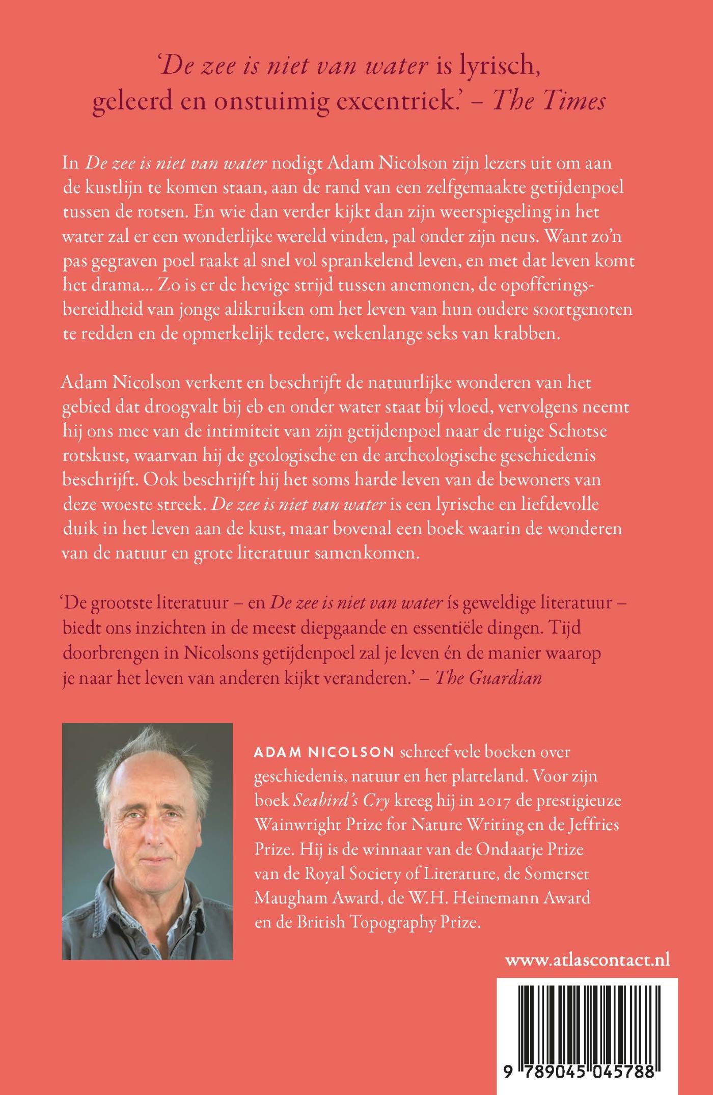 Zo is er de hevige strijd tussen anemonen, de opofferingsgezindheid van jonge alikruiken om het leven van hun oudere soortgenoten te redden en is er de opmerkelijk tedere, wekenlange seks van krabben. Adam Nicolson, zoon van Nigel Nicolson en kleinzoon van Vita Sackville-West, verkent en beschrijft de natuurlijke wonderen van het gebied dat droogvalt bij eb en onder water staat bij vloed, waarna hij ons van de kleine intimiteit van zijn rotspoel meeneemt naar de ruigte van de Schotse rotskust, waar hij de geschiedenis van de mensen en dieren in deze wilde omgeving beschrijft. De zee is niet van water is een lyrische en liefdevolle duik in het leven aan de kust, maar bovenal een boek waar de wonderen van de natuur en grote literatuur samenkomen.