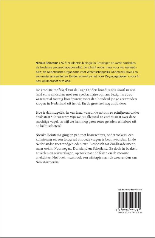 Nienke Beintema ging op pad met boswachters, onderzoekers, een kunstenaar en een fotograaf om deze vragen te beantwoorden. In de Nederlandse zeearendgebieden, van Biesbosch tot Zuidlaardermeer, maar ook in Noorwegen, Duitsland en Schotland. Ze dook in boeken, artikelen en reisverslagen, op zoek naar de feiten en de mooiste anekdotes. Het boek maakt ook een uitstapje naar de zeearenden van Noord-Amerika.