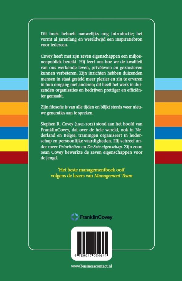 Dit boek behoeft nauwelijks nog introductie; het vormt al jarenlang en wereldwijd een inspiratiebron voor iedereen. Stephen R. Covey heeft met zijn Zeven eigenschappen een miljoenenpubliek bereikt. Zijn inzichten hebben duizenden mensen in staat gesteld meer plezier en zin te ervaren in de omgang met anderen; dit heeft het werk in duizenden organisaties en bedrijven prettiger en efficiënter gemaakt. Covey leert je hoe je de kwaliteit van je werkende leven, privéleven en gezinsleven kunt verbeteren.
