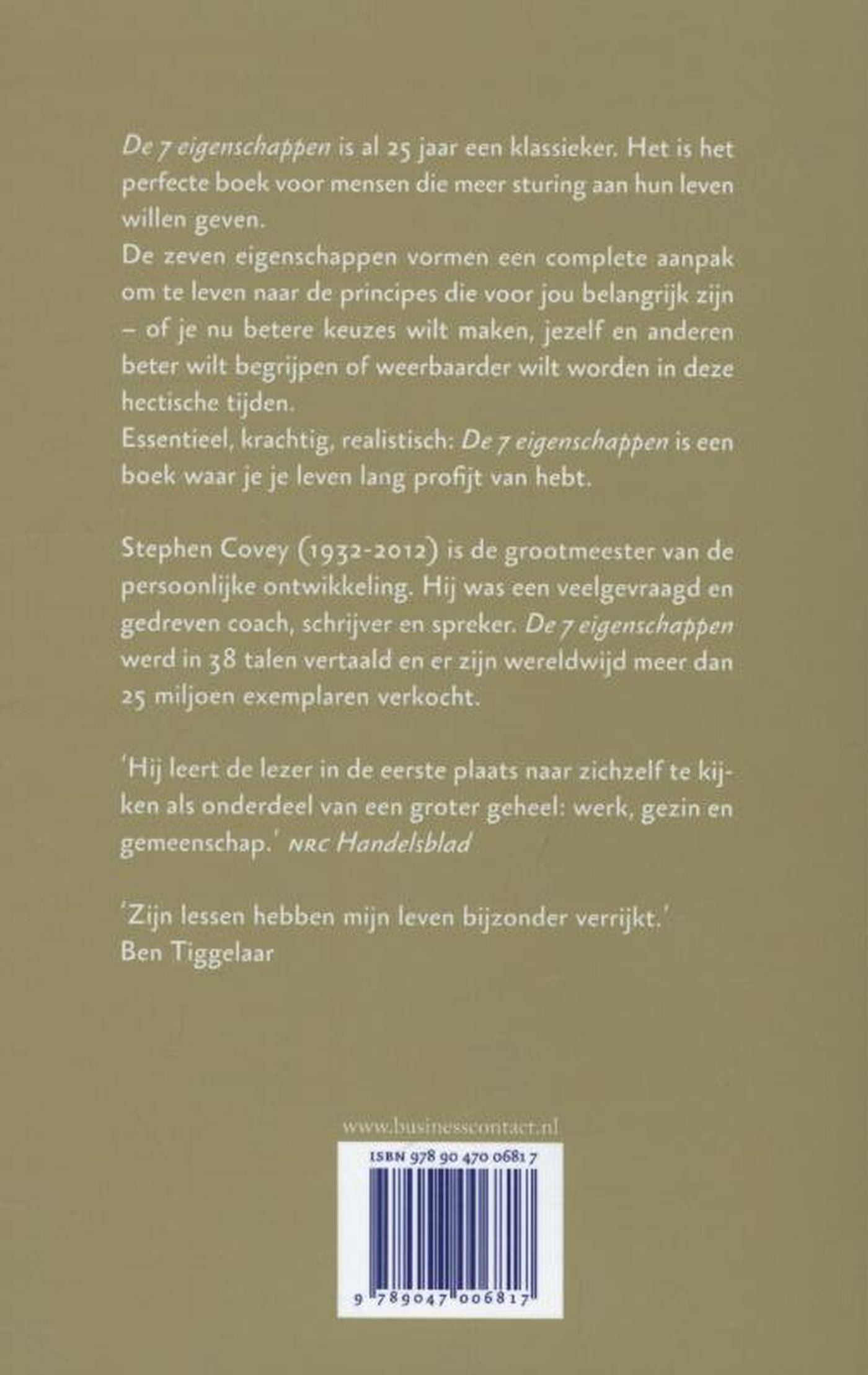 'De zeven eigenschappen' van Stephen Covey is al jaren een bestseller onder mensen die gelukkiger en succesvoller willen zijn in hun werk. Maar nog niet iedereen weet dat 'De zeven eigenschappen' even waardevol kan zijn voor geluk in je persoonlijke leven. De publiekseditie 'De zeven eigenschappen voor succes in je leven' is voor hen bedoeld. Wie succesvol wil worden, in zijn werk, maar ook in de omgang met vrienden en familie, moet weten wat hij wil en wat hij voor anderen kan betekenen. Covey ging te rade bij de grote denkers over geluk, tevredenheid, zingeving en spiritualiteit. Met een heel praktische inslag vertaalde hij hun lessen in zeven principes, eigenschappen of gewoontes ,die je voor ogen houdt in het leven van alledag. Ze helpen je te focussen op wat belangrijk is: voor jezelf, en in de omgang met anderen.