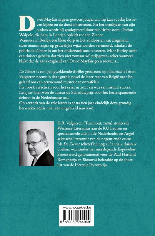 De Ziener van K.R. Valgaeren verscheen voor het eerst in 2011 en was een instant succes. Een jaar later kreeg het boek de Schaduwprijs voor het beste spannende debuut in de Nederlandse taal. Op verzoek van de vele lezers is er na tien jaar eindelijk deze nieuwe editie. De Ziener werd voor de gelegenheid grondig herwerkt door de auteur en voorzien van een nieuw en uitgebreid nawoord.