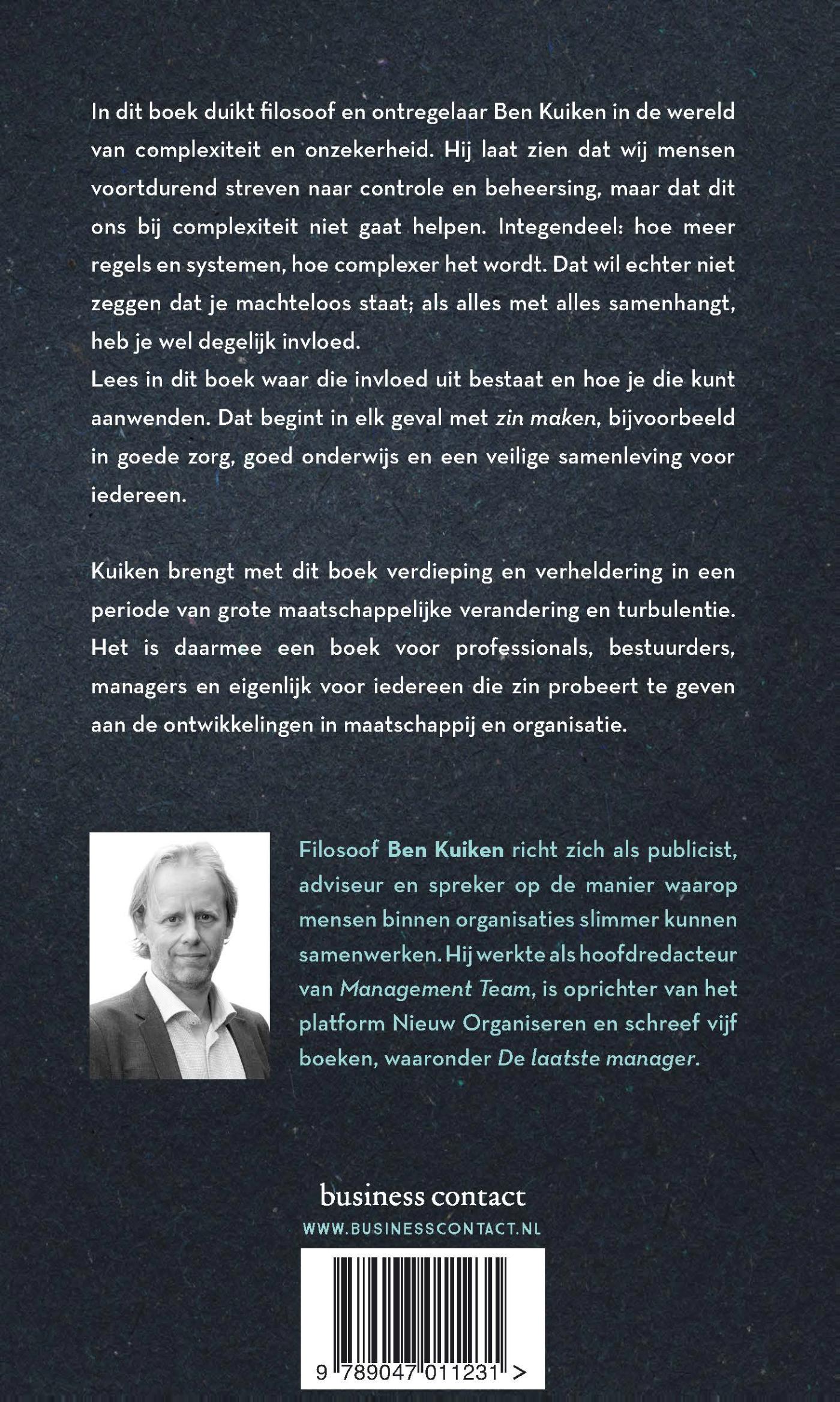 Het leven wordt steeds complexer. Zeggen we, en we knikken ernstig. Maar wat betekent dat? Wat is complexiteit eigenlijk, en hoe kun je ermee omgaan? Het helpt in elk geval niet om dingen te versimpelen en ze bijvoorbeeld in regels en protocollen te gieten. Maar wat dan wel? In dit boek duikt filosoof en ontregelaar Ben Kuiken in de wereld van complexiteit en onzekerheid. Hij laat zien dat wij mensen voortdurend streven naar controle en beheersing, maar dat dit ons bij complexiteit niet gaat helpen. Integendeel: hoe meer regels en systemen, hoe complexer het wordt. Dat wil echter niet zeggen dat je helemaal machteloos staat; als alles met alles samenhangt, heb je wel degelijk invloed. Leer van de pioniers van het nieuwe organiseren en laat je inspireren door de manier waarop zij de complexiteit te lijf gaan. Dat begint in elk geval met zin maken, bijvoorbeeld in goede zorg, goed onderwijs en een veilige samenleving voor iedereen. Kuiken brengt met dit boek verdieping en verheldering in een periode van system change. Als mens, professional, manager of ondernemer kun je er alleen maar beter van worden.