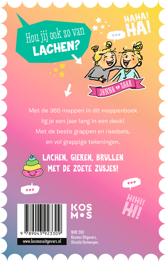 Kijk uit, de slappe lach ligt op de loer met het nieuwe De Zoete zusjes moppenboek van Hanneke de Zoete. Fans stuurden duizenden moppen op naar de Zoete zusjes, en dit zijn de 365 allerallerleukste. Voor elke dag is er een goeie grap! Dat wordt lachen, gieren en brullen met Janna en Saar.