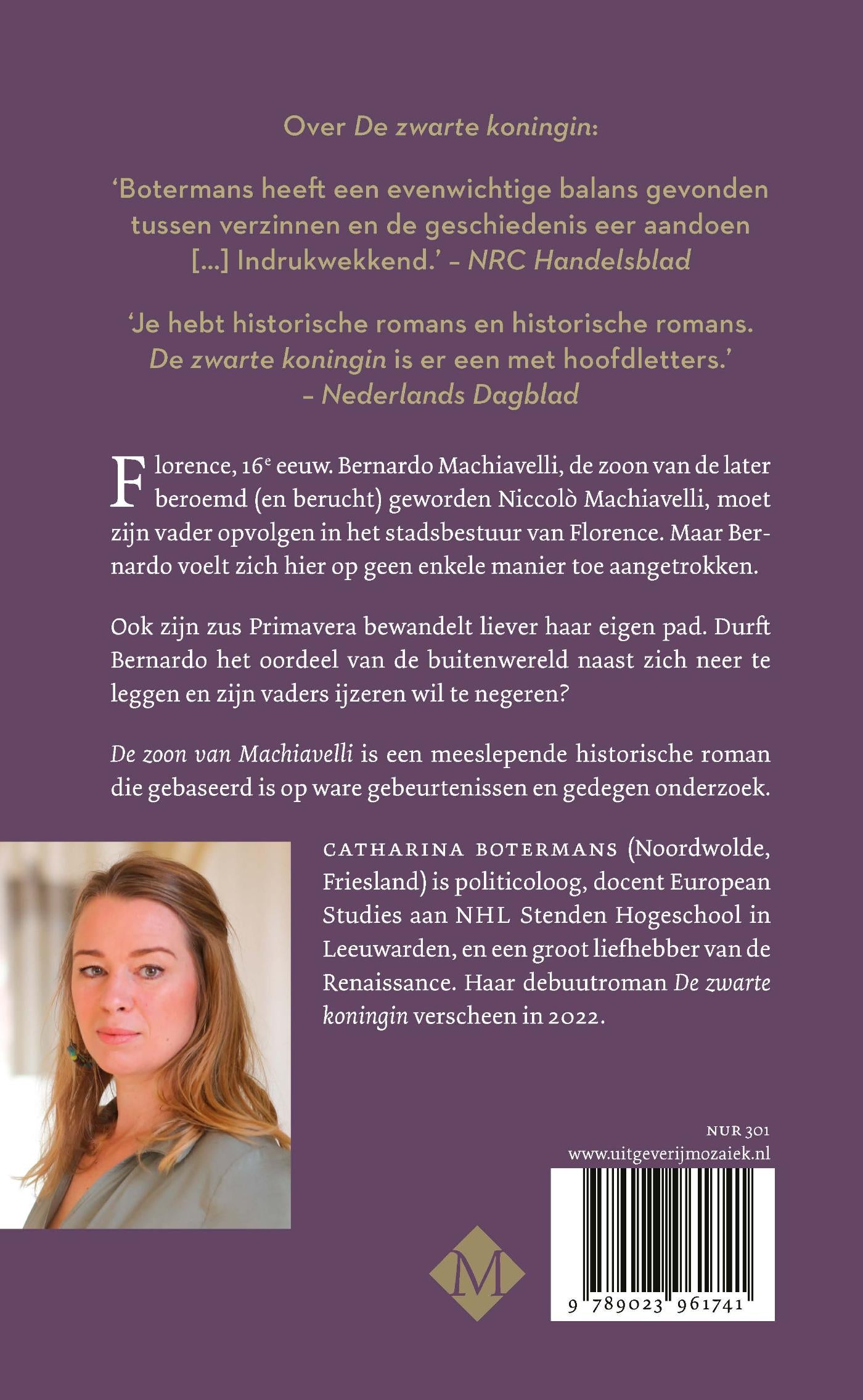 In De zoon van Machiavelli brengt Catharina Botermans Bernardo, de zoon van de beroemde Niccolò Machiavelli, heel dichtbij. Op basis van ware gebeurtenissen en gedegen onderzoek schetst ze een overtuigend portret.
