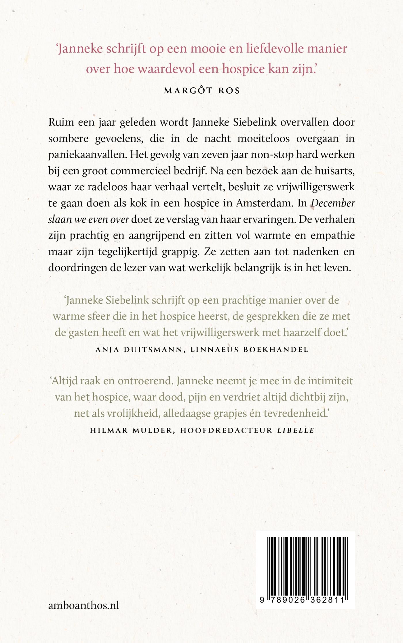 Ruim een jaar geleden wordt Janneke Siebelink overvallen door sombere gevoelens, die in de nacht moeiteloos overgaan in paniekaanvallen. Het gevolg van zeven jaar non-stop hard werken bij een groot commercieel bedrijf. Na een bezoek aan de huisarts, waar ze radeloos haar verhaal vertelt, besluit ze vrijwilligerswerk te gaan doen als kok in een hospice in Amsterdam. In December slaan we even over doet ze verslag van haar ervaringen. De verhalen zijn prachtig, aangrijpend en vol warmte en empathie maar tegelijkertijd grappig. December slaan we even over van Janneke Siebelink zet aan tot nadenken en doordringt de lezer van wat werkelijk belangrijk is in het leven.