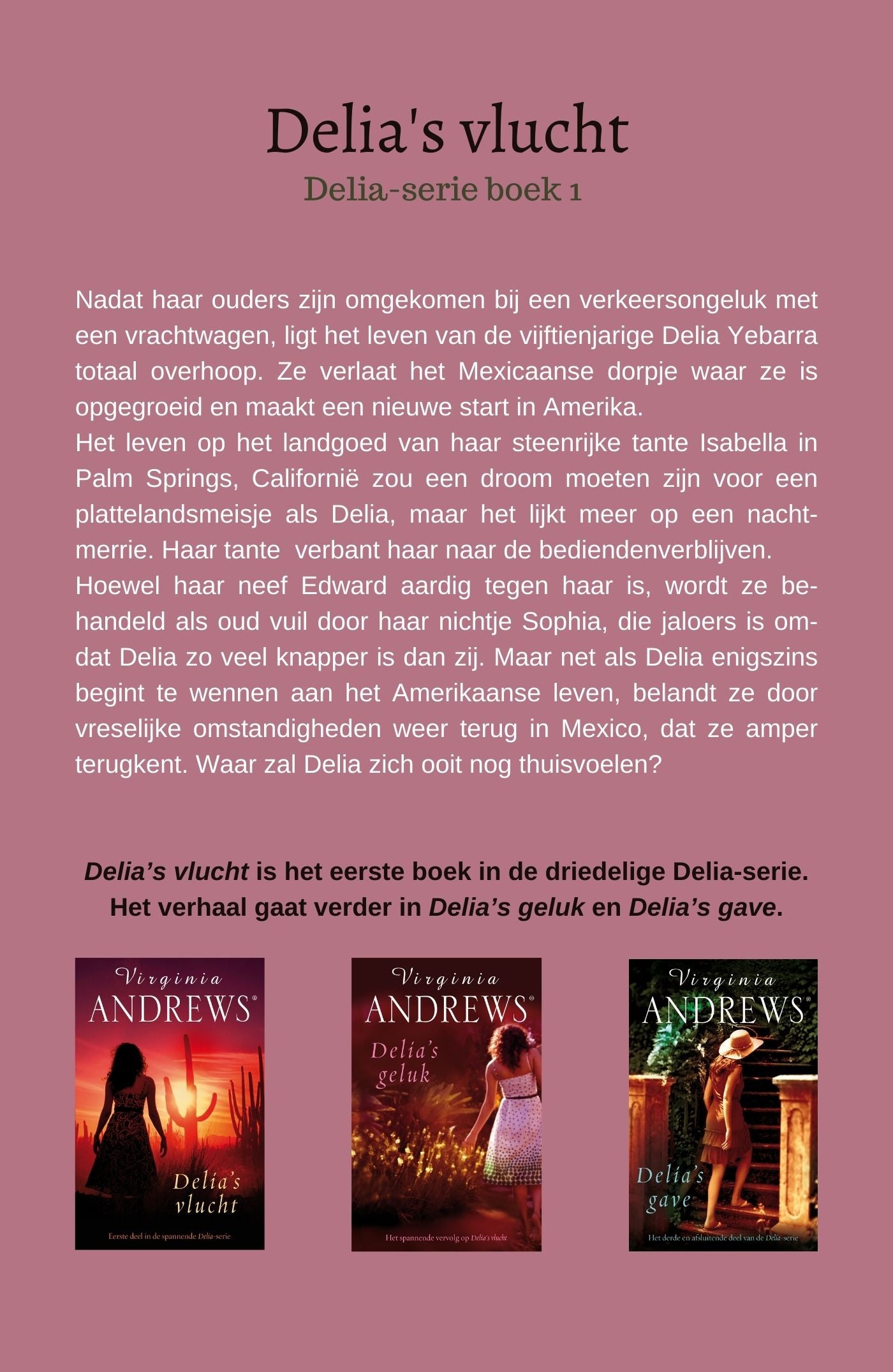 ‘Delia’s vlucht’ is het eerste deel van de driedelige Delia-serie van bestsellerauteur Virginia Andrews.