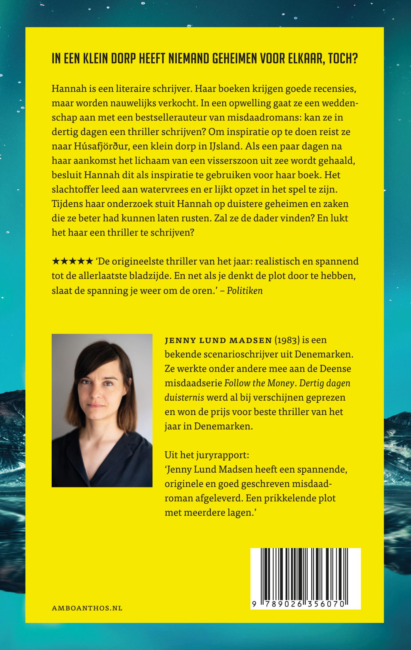 In Dertig dagen duisternis van Jenny Lund Madsen stuit een schrijver op zoek naar inspiratie op een moordzaak. Dertig dagen duisternis is bekroond als beste Deense thriller. Voor fans van de tv-serie Trapped.