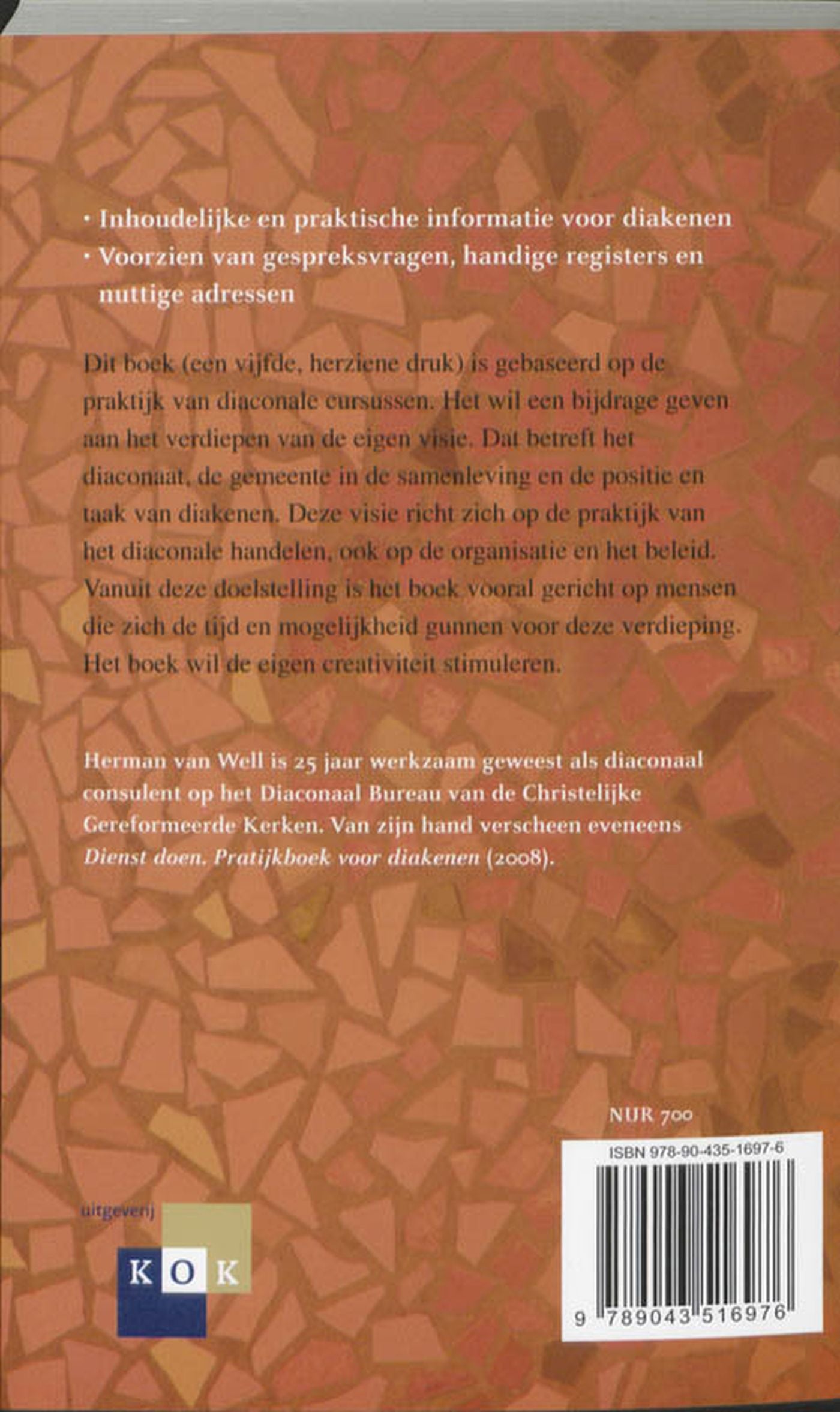 Dit boek (een vijfde, herziene druk) is gebaseerd op de praktijk van diaconale cursussen. Het wil een bijdrage geven aan het verdiepen van de eigen visie. Dat betreft diaconaat, de gemeente in de samenleving en de positie en taak van diakenen. Deze visie richt zich op de praktijk van het diaconale handelen, ook op de organisatie en het beleid.