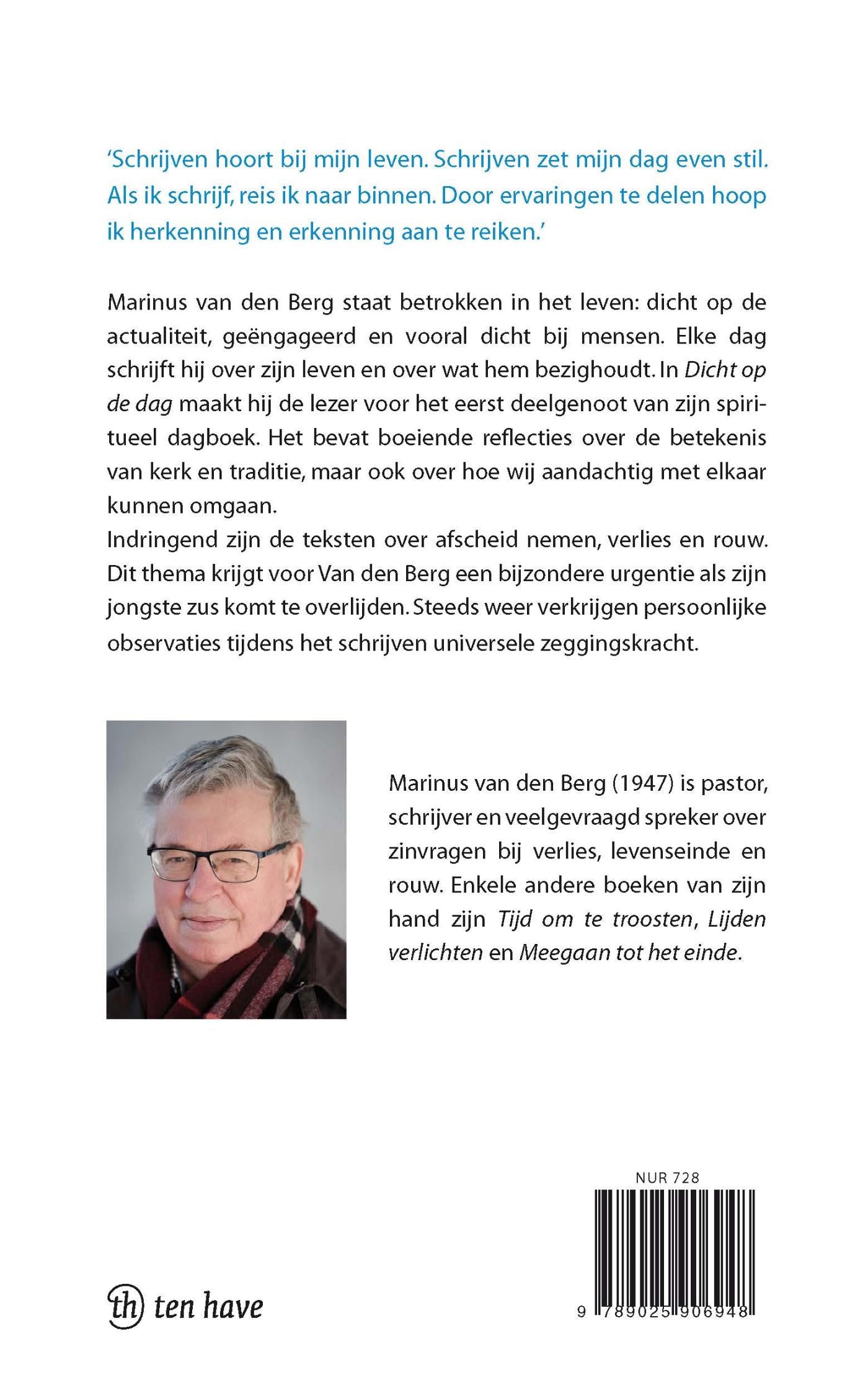 Het boek 'Dicht op de dag' is een persoonlijk boek, waarin Van den Berg zoekt naar spirituele bronnen, die betekenis kunnen geven aan ons leven. Wat is in het informatietijdperk echt van betekenis? Marinus van den Berg zoekt antwoorden in korte, poëtische teksten en in langere prozateksten. Hij schrijft op de huid van de dag, maar gaat ook eerlijk na wat de actualiteit onderhuids met hem doet. Daarbij schenkt hij aandacht aan de christelijke traditie waarin hijzelf staat.