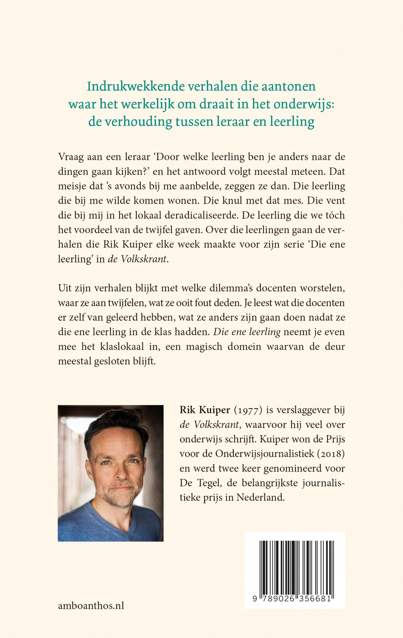 Die ene leerling van Rik Kuiper, bekend van de indrukwekkende en populaire serie in de Volkskrant, is verplichte literatuur voor wie in het onderwijs werkt, schoolgaande kinderen heeft of zelf ooit naar school is geweest. Docenten vertellen over de leerling die hun kijk op het onderwijs voor altijd veranderde. De columns uit de Volkskrant zijn nu gebundeld, zoals eerder is gebeurd bij Die ene patiënt van Ellen Visser.