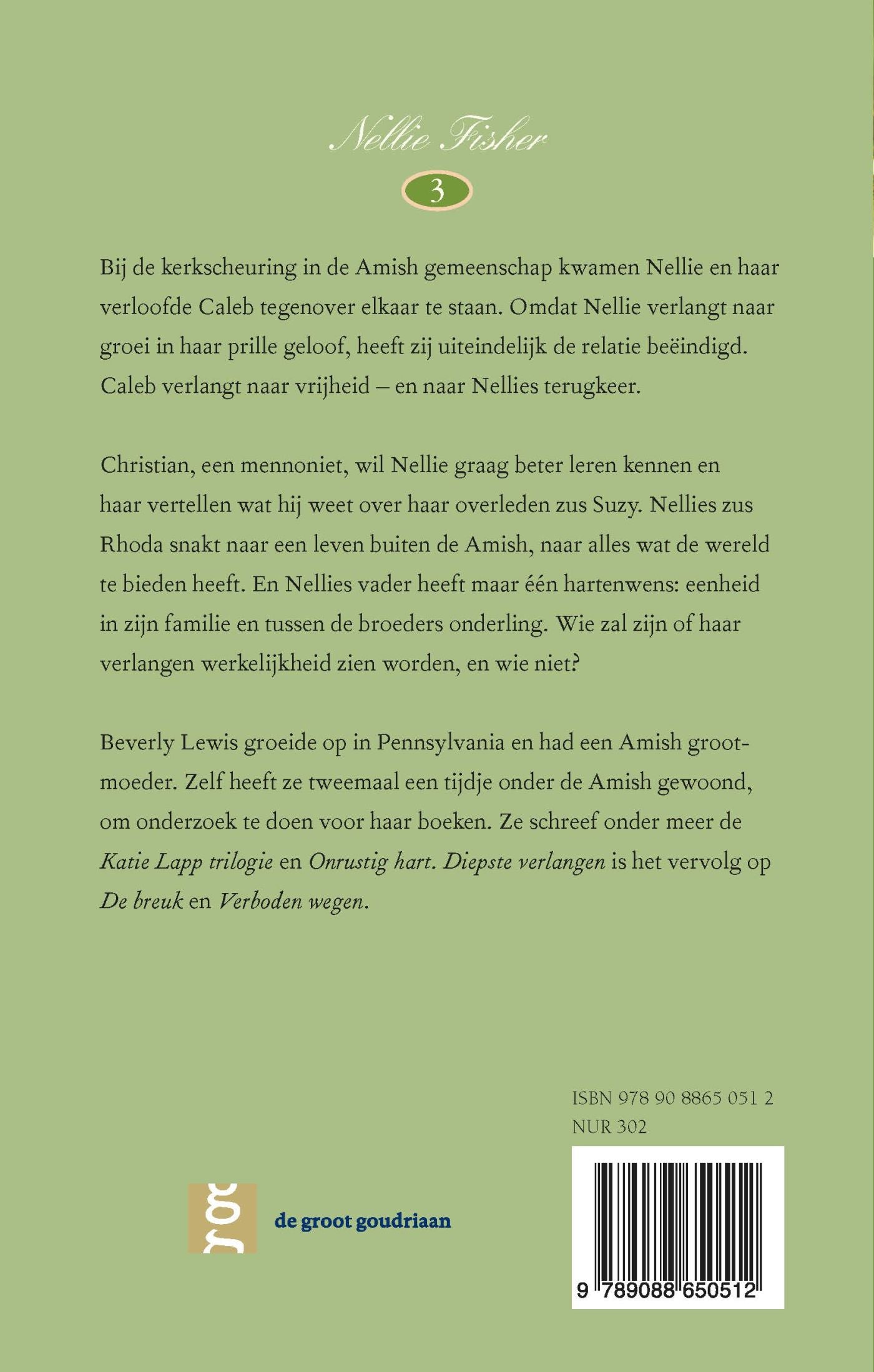 Deel 3 `Diepste verlangen`. De populaire Nellie Fisher-serie van de Amerikaanse schrijfster Beverly Lewis is nu gebundeld in een trilogie. Hoofdpersoon Nellie Fisher bevindt zich in een moeilijke positie als haar familie overweegt zich af te scheiden van de Amish-kerk. Als dat gebeurt, verliest Nellie haar geliefde Caleb. Hij houdt namelijk vast aan de wegen van de Old Order-gemeenschap. Maar als Nellie voor Caleb kiest, moet ze haar familie loslaten. Is er een uitweg voor haar dilemma? De Nellie Fisher trilogie van Beverly Lewis bevat de titels De breuk, Verboden wegen en Diepste verlangen.