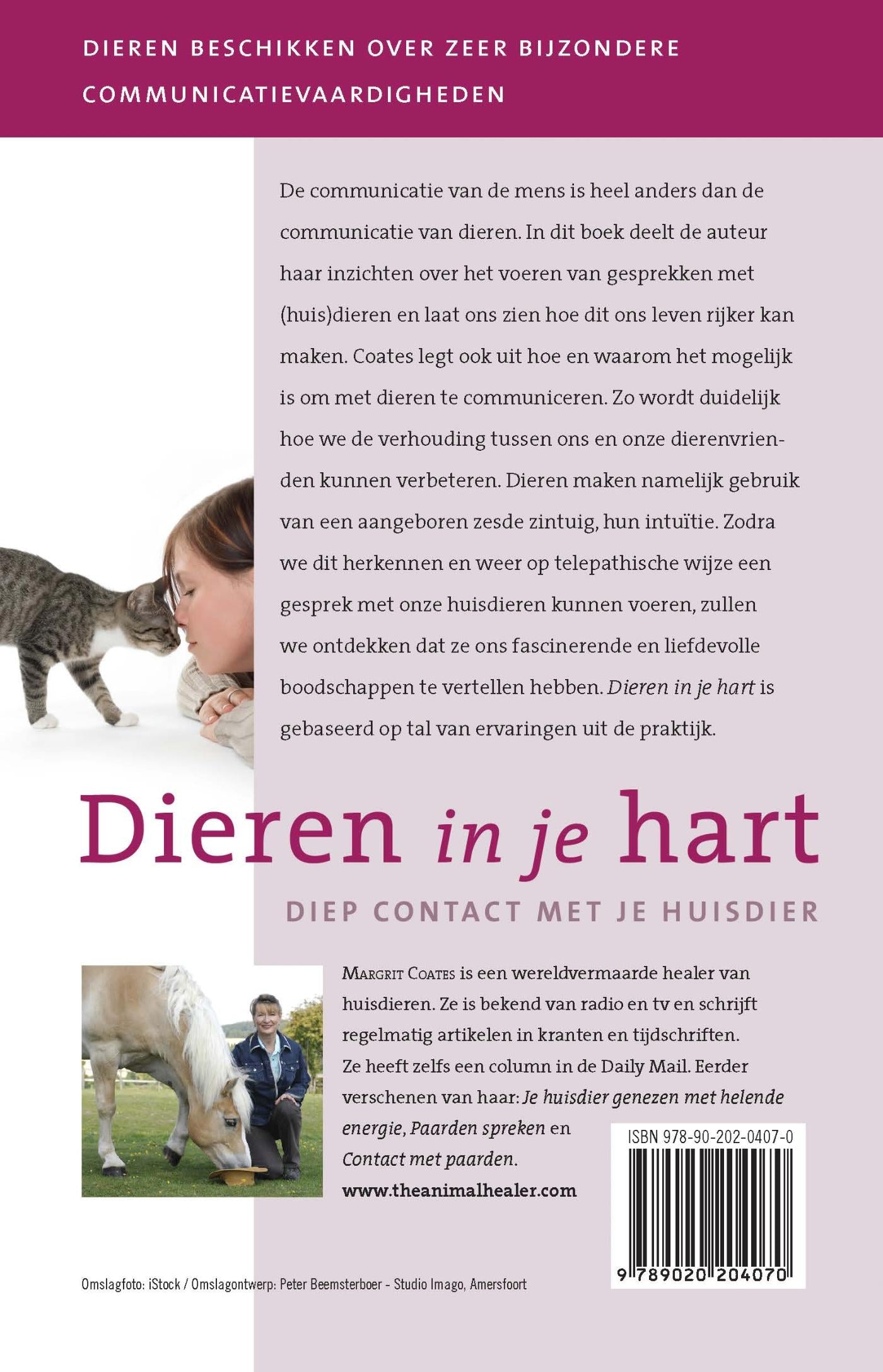 De communicatie van de mens is heel anders dan de communicatie van dieren. In dit boek deelt de auteur haar inzichten over het voeren van gesprekken met (huis)dieren en laat ons zien hoe dit ons leven rijker kan maken. Coates legt ook uit hoe en waarom het mogelijk is om met dieren te communiceren. Zo wordt duidelijk hoe we de verhouding tussen ons en onze dierenvrienden kunnen verbeteren. Dieren maken namelijk gebruik van een aangeboren zesde zintuig, hun intuïtie. Zodra we dit herkennen en weer op telepathische wijze een gesprek met onze huisdieren kunnen voeren, zullen we ontdekken dat ze ons fascinerende en liefdevolle boodschappen te vertellen hebben. Dieren in je hart is gebaseerd op tal van ervaringen uit de praktijk.
